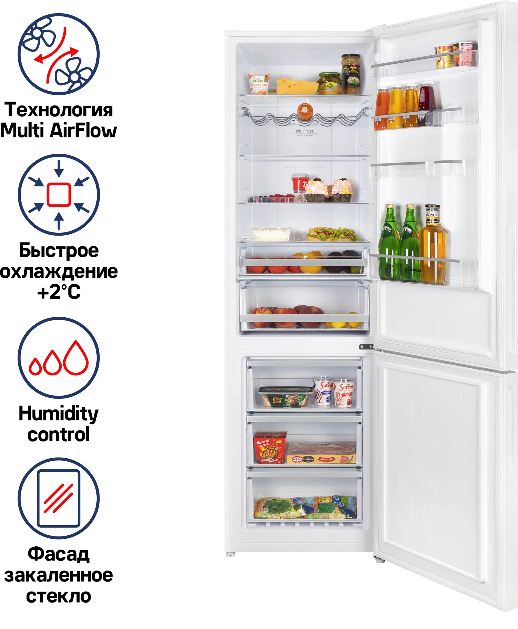 индикация температуры, система контроля влажности, Full No Frost, Антибактериальное покрытие камеры, Дисплей, Зона свежести, Светодиодная подсветка, Скрытые ручки, Суперохлаждение