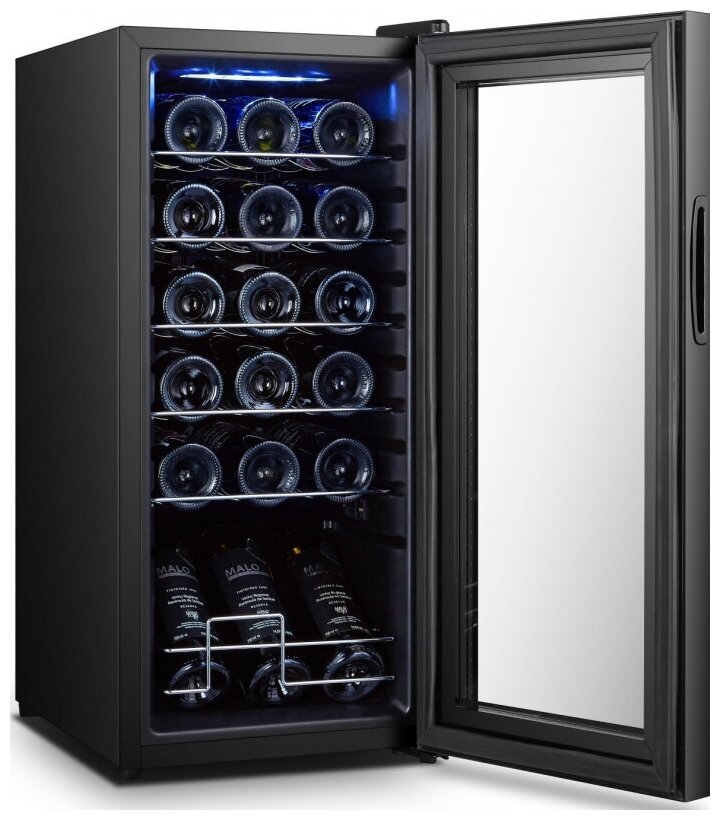 диапазон температур 5-18ºC; пространство в основании позволяет хранить 3 бутылки по диагонали, эта опция дает возможность хранить уже открытые бутылки