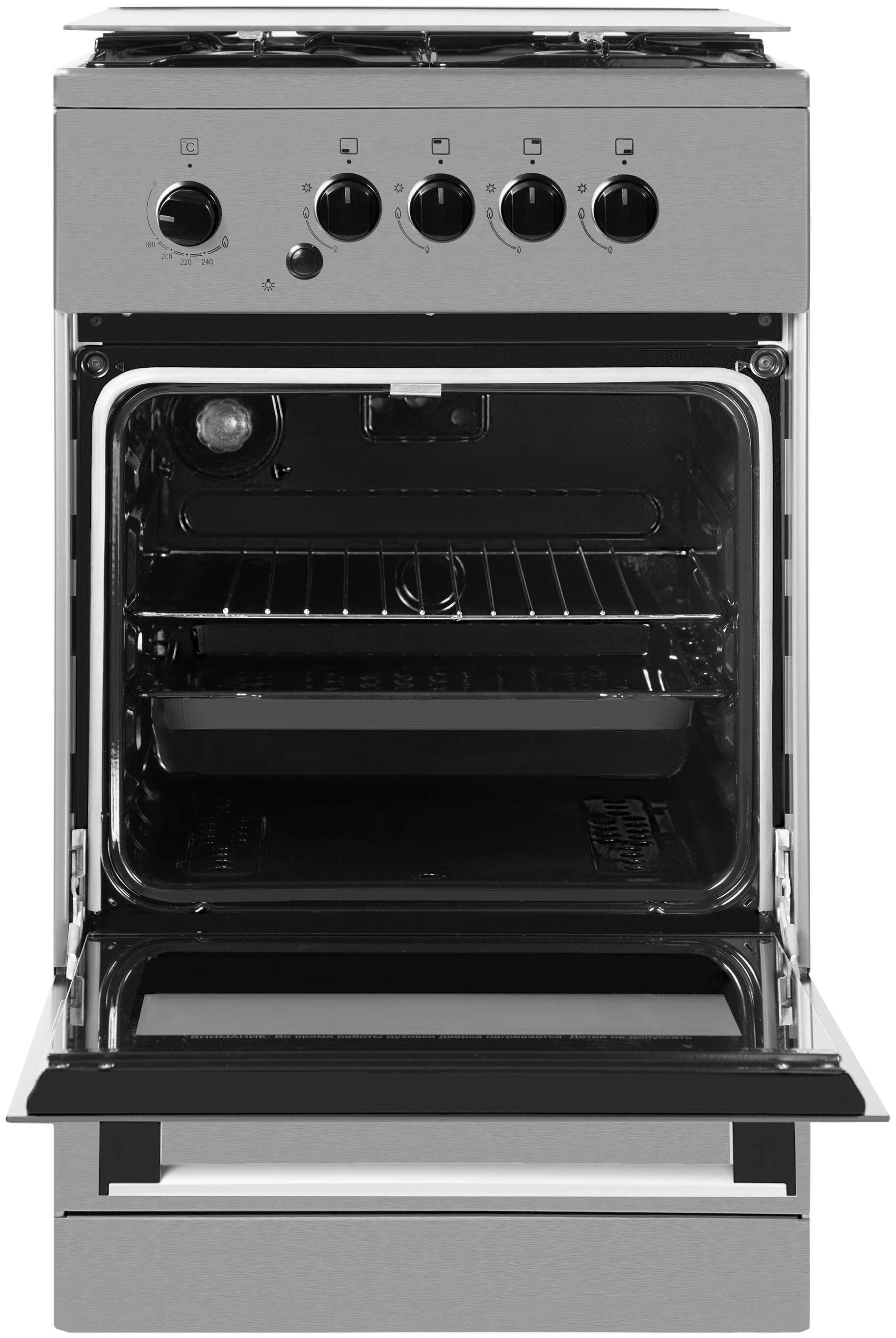 мощность конфорок 1х3 кВт, 2х2 кВт, 1х1 кВт; мощность духовки 2,6 кВт; комплект для подключения сжиженного газа