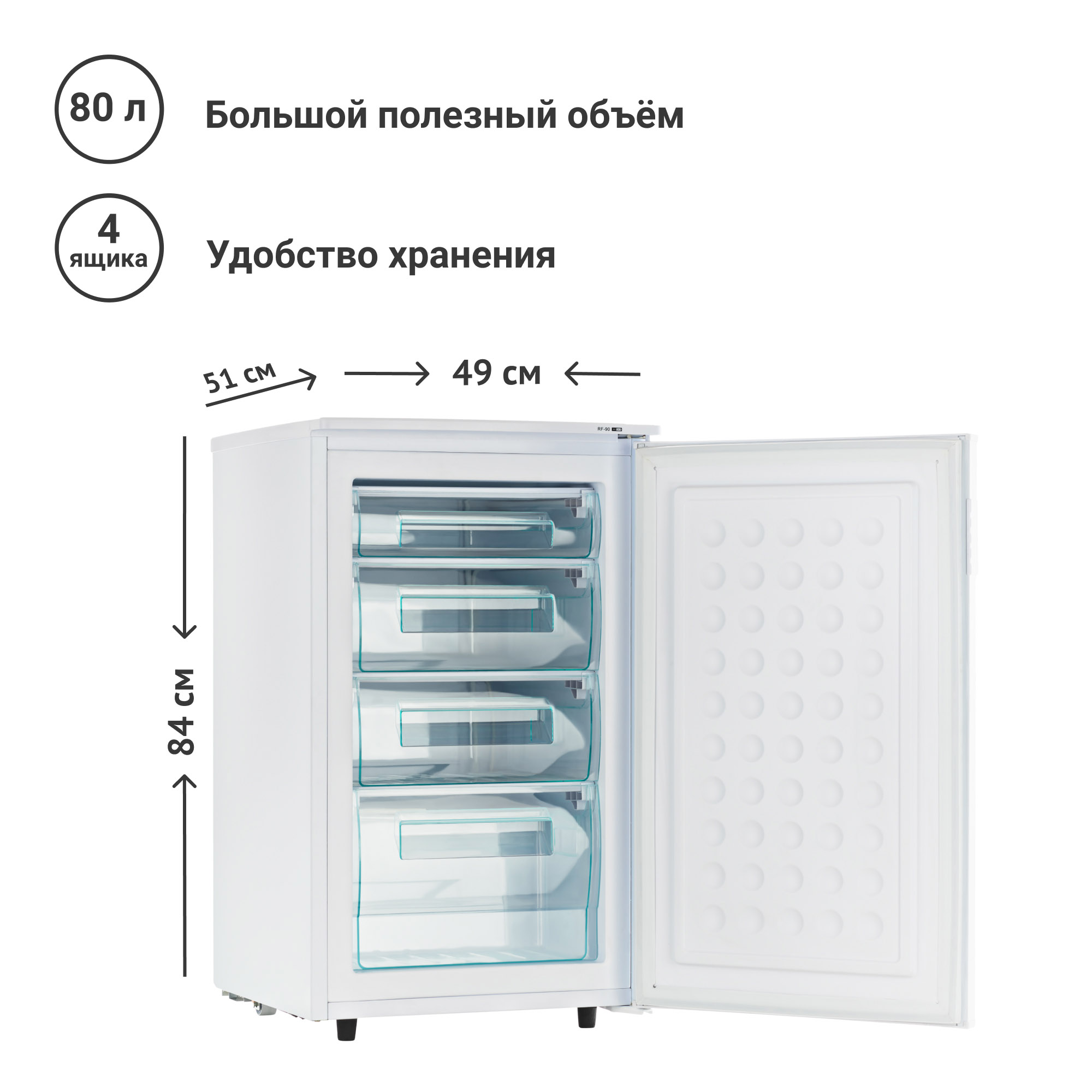 Полезный объём морозильника - 80 литров в 4-х нишах разного размера.