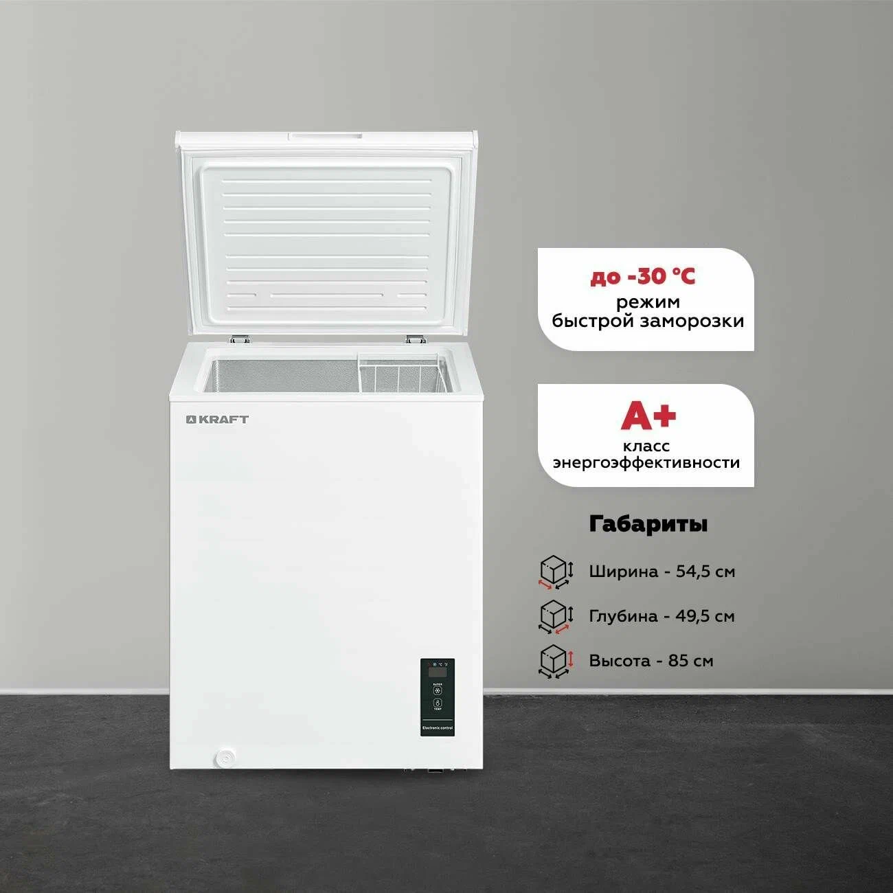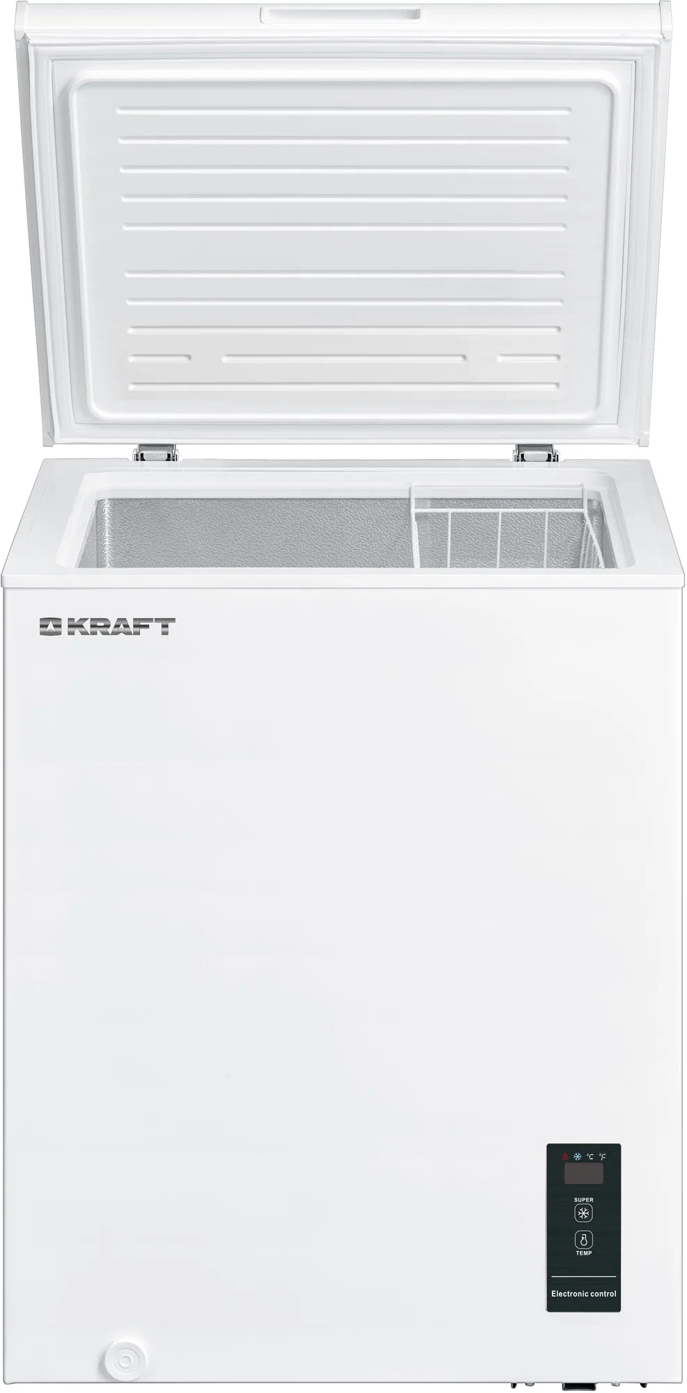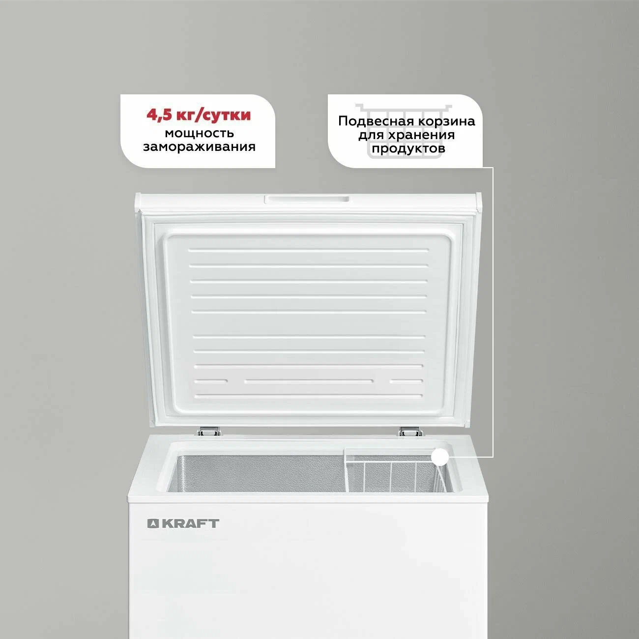 Мощность заморозки Kraft BD(W)-100BL составляет 4,5 кг/сутки. При отключении света морозильный ларь сохраняет низкую температуру в морозильной камере до 17 часов. При активации режима «Суперзаморозка» температура в камере достигает -30°C. Низкий уровень шума не превышает 38 дБ. Рекомендуемый диапазон температур эксплуатации ларя от +10 до +43°С.
