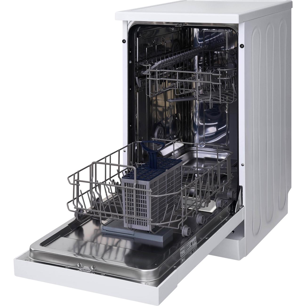 Модель оснащена пятью программами мытья, в том числе присутствует ускоренный режим, мини-программа на 29 минут. Таймер отложенного старта до 24 часов позволяет запустить посудомоечную машину в удобное время. Доступен сенсор чистоты воды, зона интенсивного мытья, отключение звукового сигнала. Потребляемая мощность равна 1750 Вт. Установлен теплообменник. Для безопасности использования служит автоматическое отключение, самодиагностика неисправностей, защита от детей, частичная защита от протечек. Корпус габаритами 84,5х60х60 см оснащен держателем для шланга. Цвет модели — белый. В комплектацию включены: воронка для засыпания соли, корзина для столовых приборов. Вес — 35 кг.