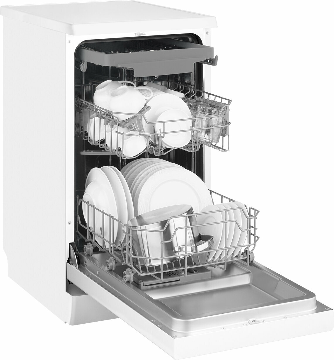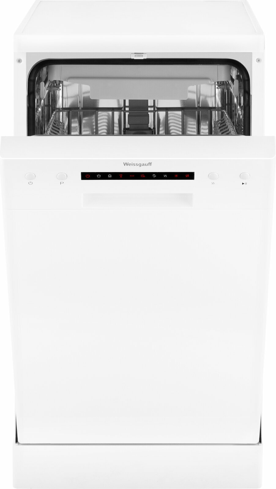 Узкая отдельностоящая посудомоечная машина Weissgauff с полностью электронным управлением, тремя корзинами и вместимостью посуды до 10 комплектов - это не только экономия места на кухне, но и отличное качество мытья вашей посуды.