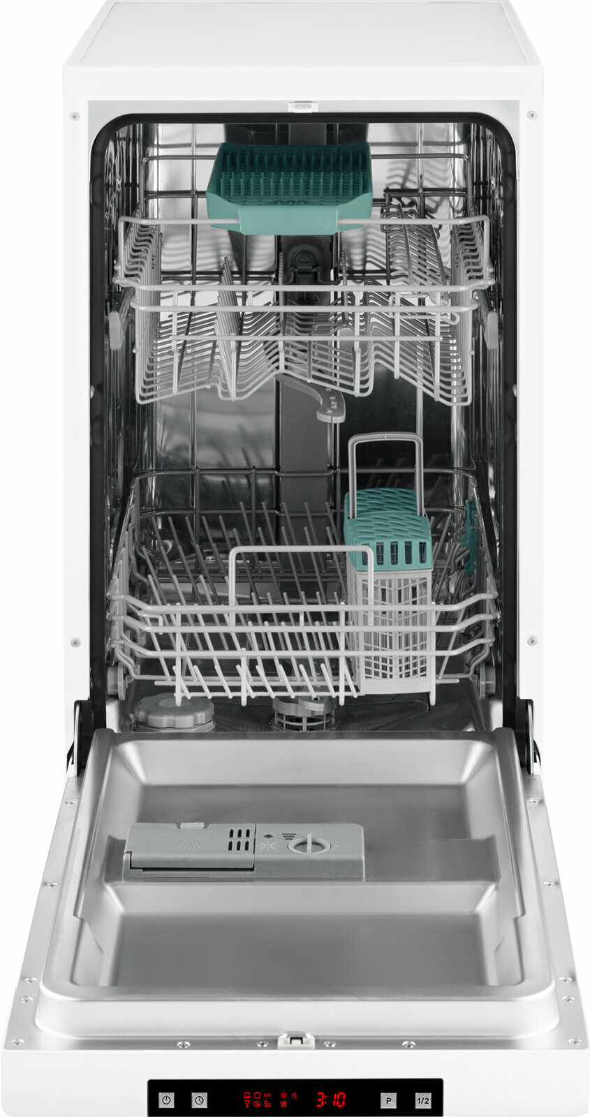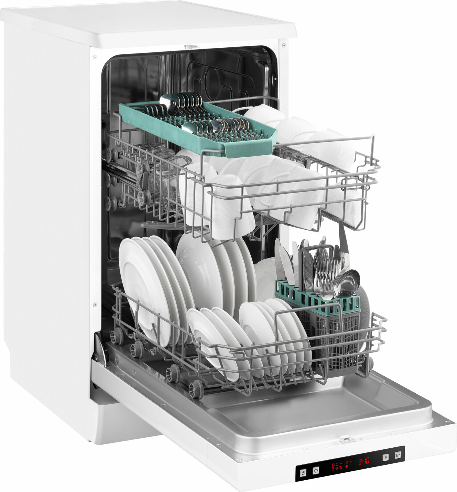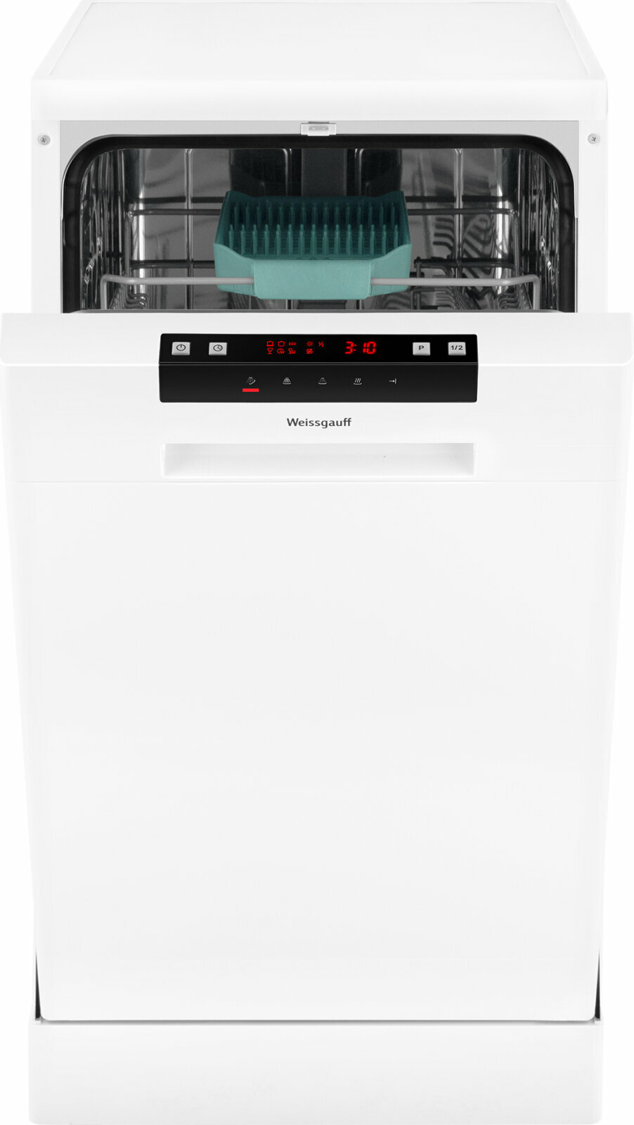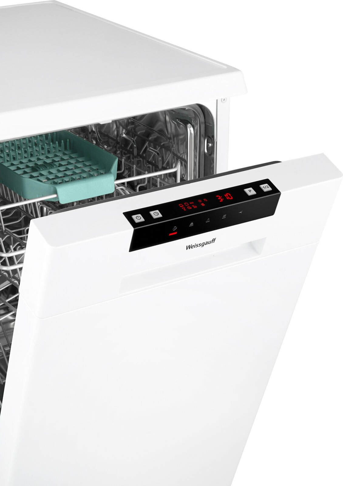 Узкая отдельностоящая посудомоечная машина Weissgauff, оснащенная тремя корзинами, с полностью электронным управлением, таймером до 24 часов и вместимостью посуды до 10 комплектов - это не только экономия места на кухне, но и отличное качество мытья вашей посуды.