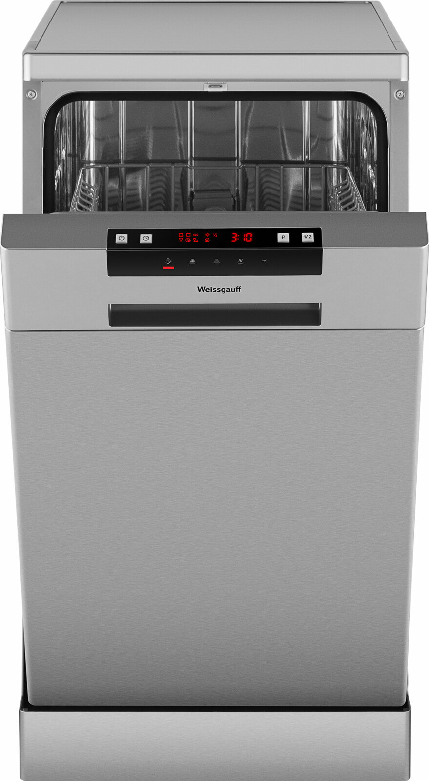 Узкая отдельностоящая посудомоечная машина Weissgauff, выполненная в цвете "серебристый металлик", с полностью электронным управлением, наличием автопрограммы, функцией самоочистки и вместимостью посуды до 9 комплектов - это не только экономия места на кухне, но и отличное качество мытья вашей посуды.