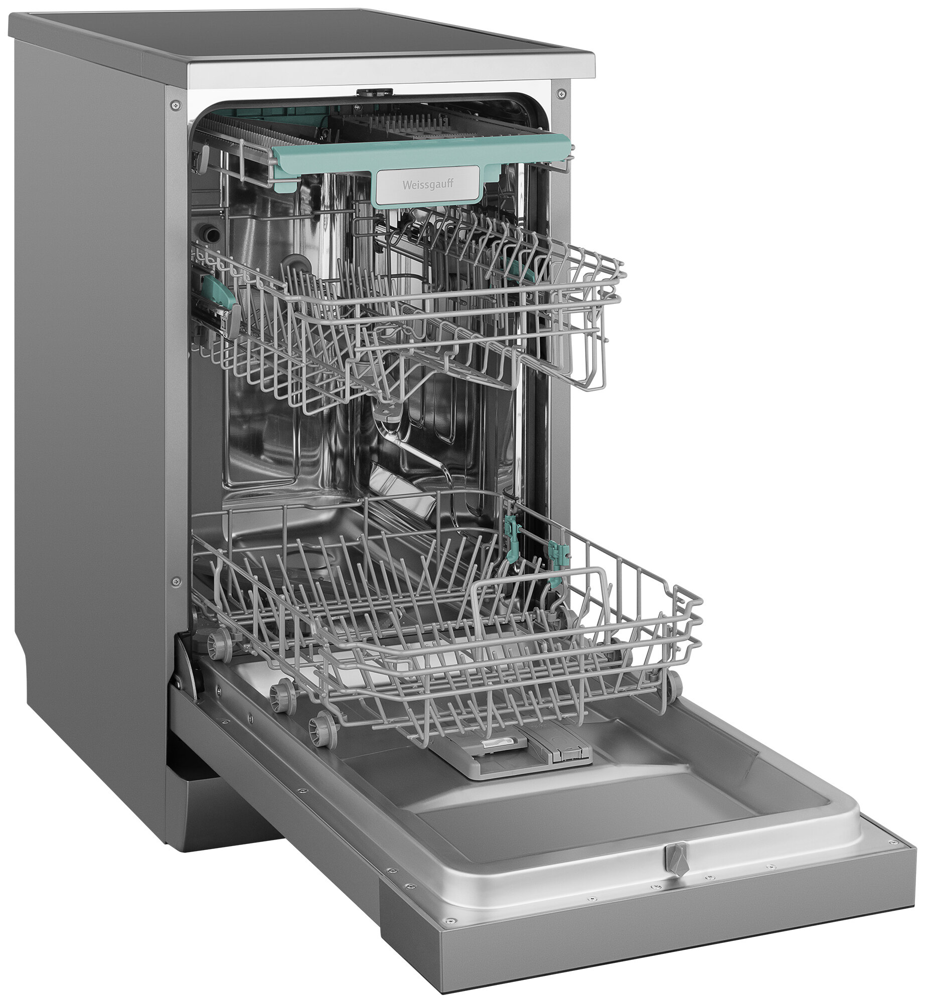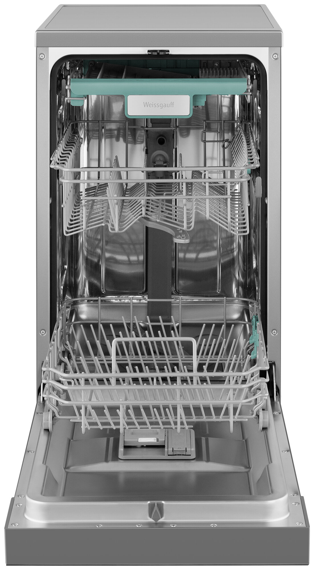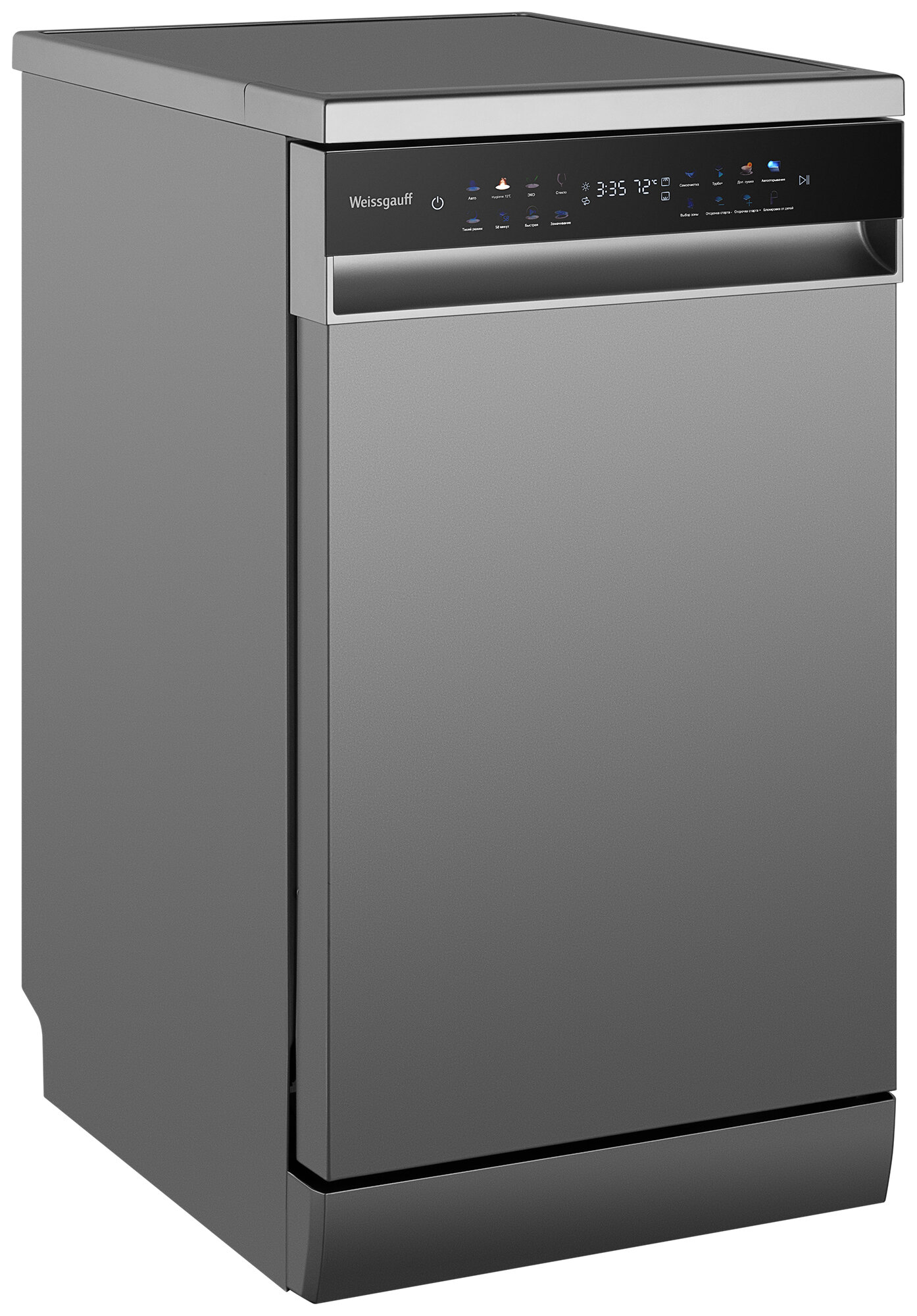 Узкая отдельностоящая посудомоечная машина Weissgauff c корпусом, выполненным в цвете "серебро" и дверью, выполненной в дизайне "нержавеющая сталь" с инновационным цветным дисплем SMART SCREEN с сенсорным управлением, инверторным двигателем и функцией автоматического открытия дверцы, не только сэкономит место на вашей кухне, но и обеспечит идеальный результат: 3 корзины позволят расположить посуду оптимальным образом для достижения наилучшего качества мытья, а вместимость посуды до 10 комплектов - это не только экономия места на кухне, но и отличное качество мытья вашей посуды.