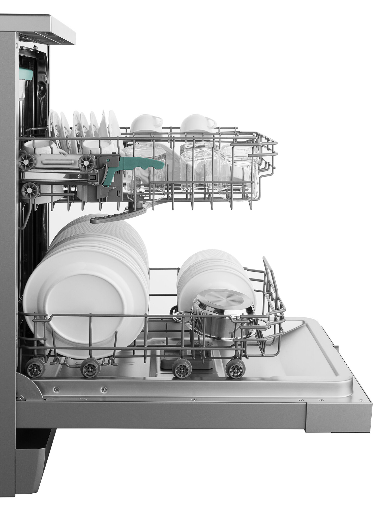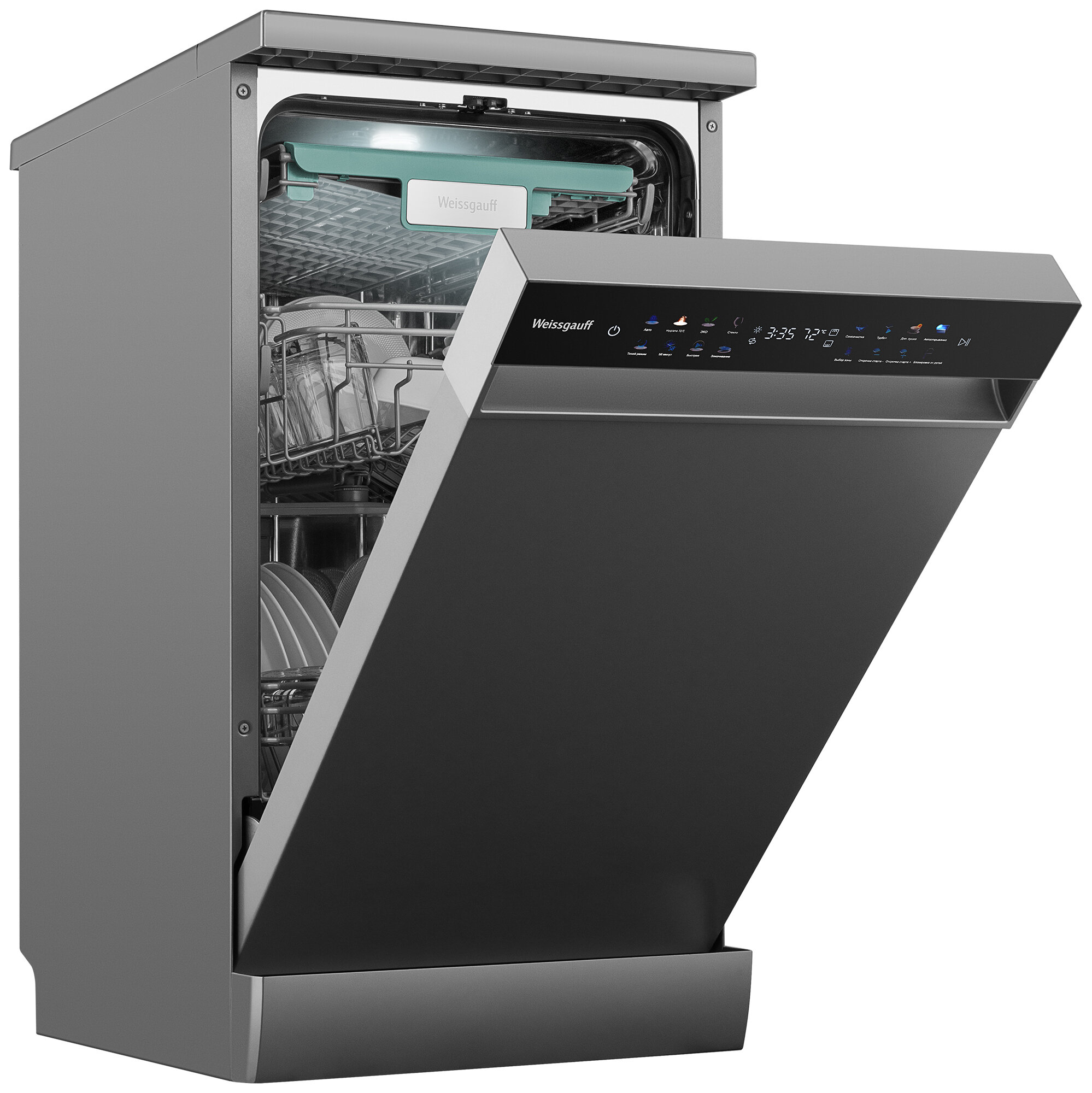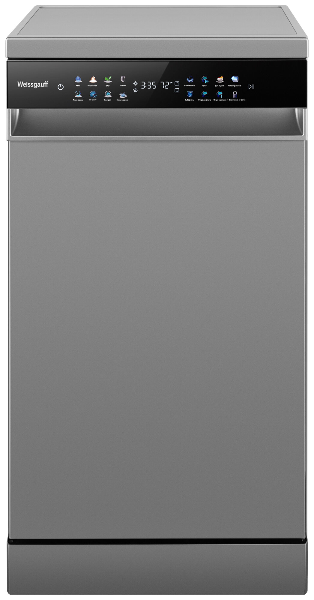 Узкая отдельностоящая посудомоечная машина Weissgauff c корпусом, выполненным в цвете "серебро" и дверью, выполненной в дизайне "нержавеющая сталь" с инновационным цветным дисплем SMART SCREEN с сенсорным управлением, инверторным двигателем и функцией автоматического открытия дверцы, не только сэкономит место на вашей кухне, но и обеспечит идеальный результат: 3 корзины позволят расположить посуду оптимальным образом для достижения наилучшего качества мытья, а вместимость посуды до 10 комплектов - это не только экономия места на кухне, но и отличное качество мытья вашей посуды.
