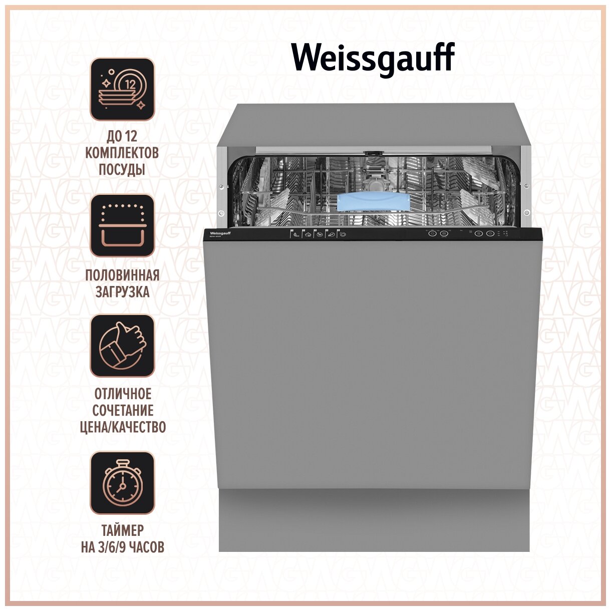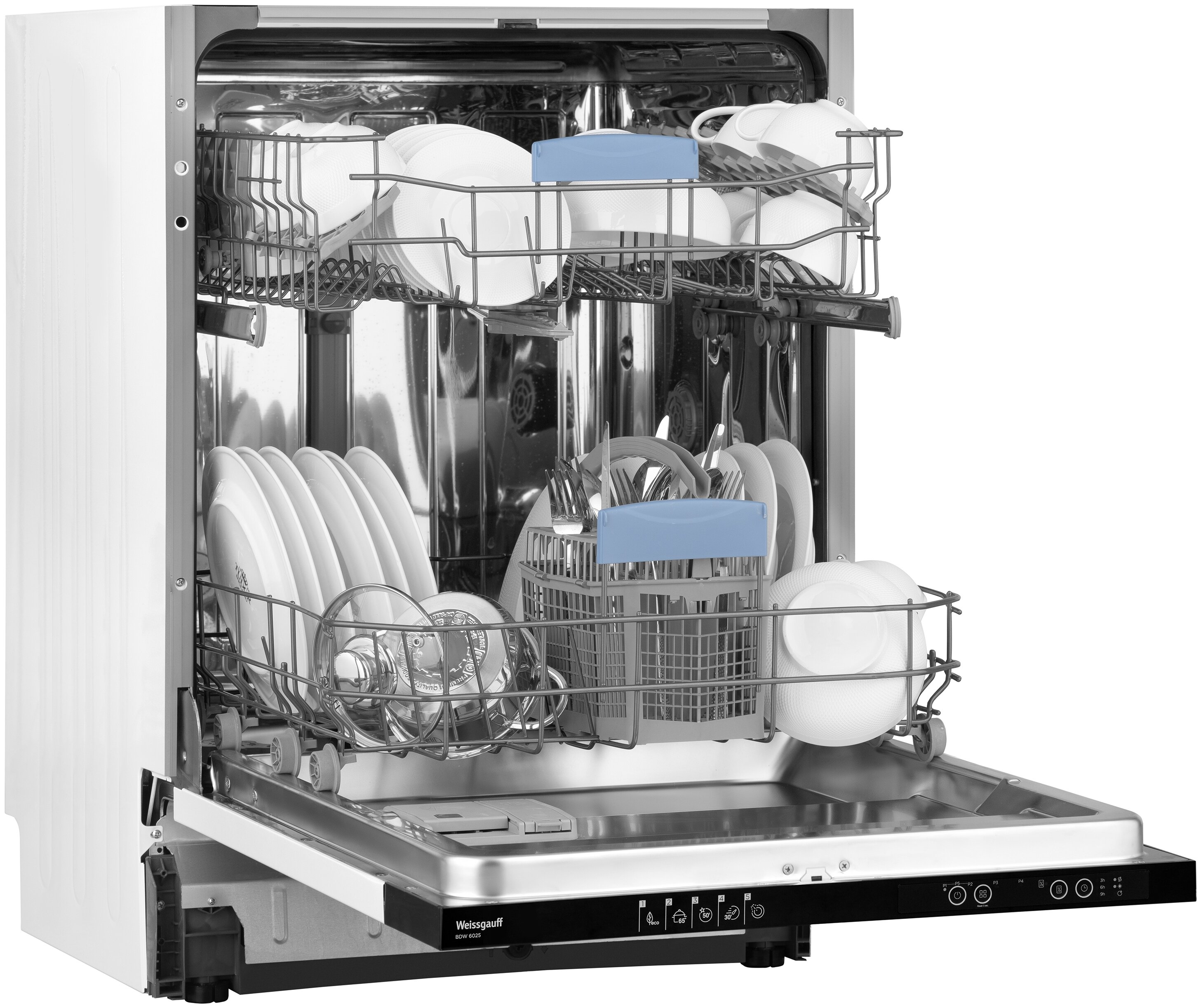 Посудомоечная машина встраиваемая Weissgauff BDW 6025. Встраиваемая посудомоечная машина Weissgauff шириной 60 см воплощает в себе один из наших ключевых принципов: достойное качество по разумной цене! Эта модель оснащена двумя функциональными корзинами и обладает вместимостью 12 комплектов посуды. А 5 эффективных программ всегда помогут подобрать оптимальный режим в зависимости от типа посуды и уровня загрязненности.