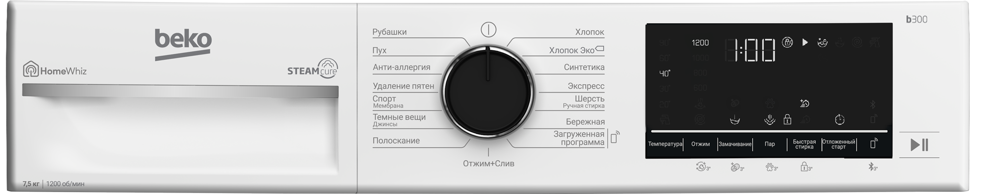 быстрая стирка, выбор скорости отжима, выбор температуры стирки, замачивание, отсрочка старта, пар, старт/пауза