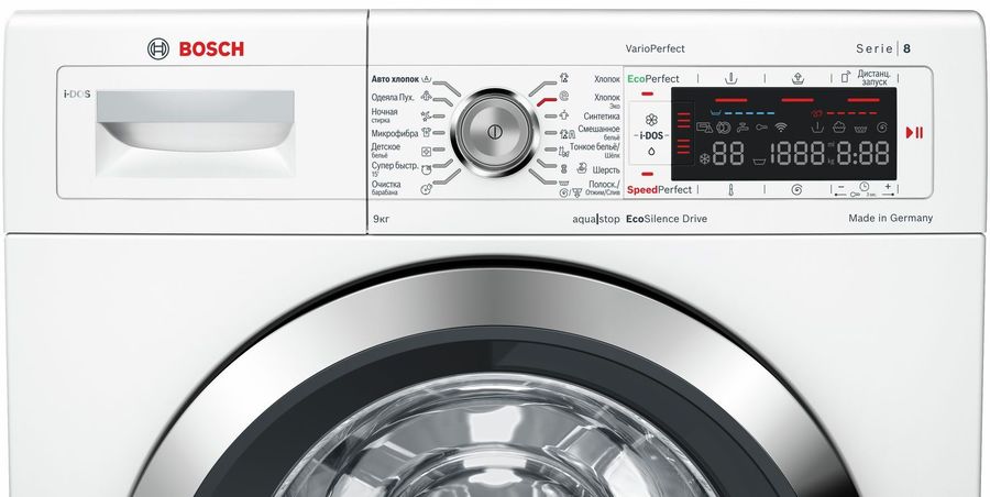 Особенности Serie 8 Home Connect. Система I–Dos ™:великолепный результат с минимальными затратами энергии и максимумом комфорта. EcoSilence Drive™: бесконтактный мотор нового поколения – тихий, эффективный и долговечный. Клавиши ComfortControl. Барабан VarioDrum. VarioPerfect: быстрая или экономичная стирка.
