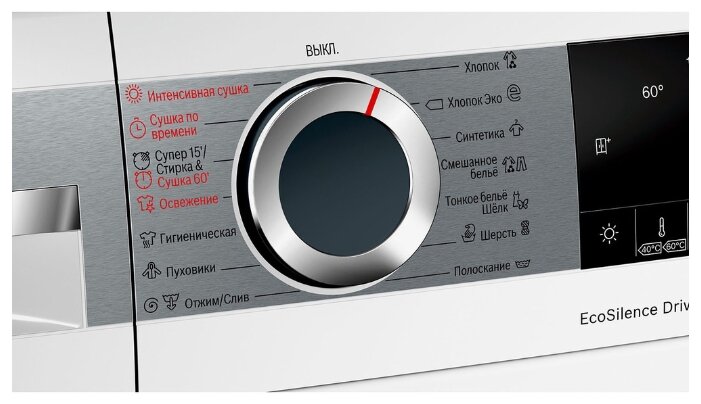 Программы: Хлопок, Хлопок Эко, Синтетика, Смешанное белье, Тонкое белье/шелк, Шерсть, Полоскание, Отжим/слив, Пуховики, Гигиеническая, Освежение: smartFinish, Супер 15 мин / Стирка и сушка 60 мин., Сушка по времени, Интенсивная сушка
