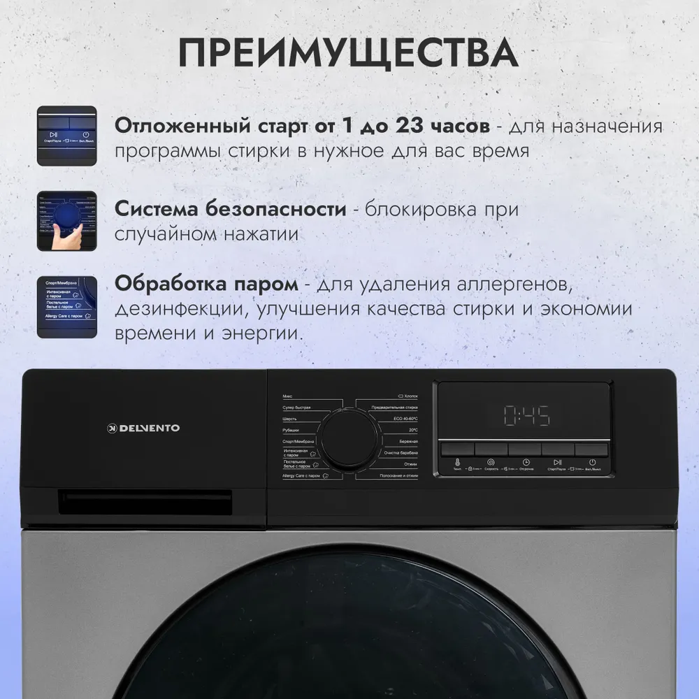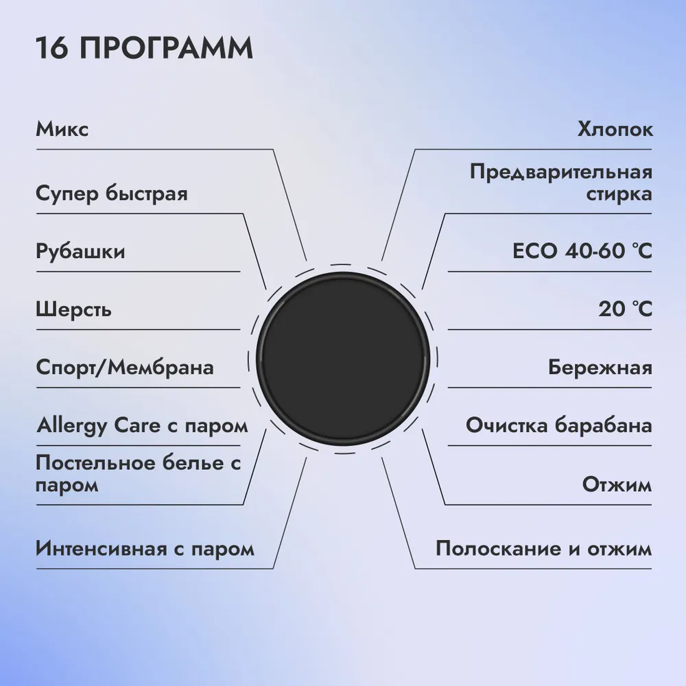 Программы стирки: Быстрая стирка, Ежедневная стирка, Интенсивная стирка, Отжим, Полоскание + отжим, Полоскание, Стирка рубашек, Стирка одеял, Стирка нижнего белья, Стирка спортивной одежды, Экономичная стирка