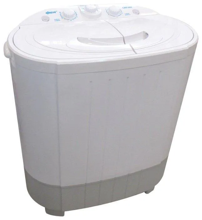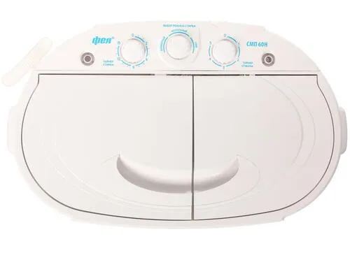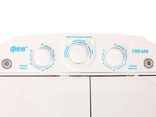 Когда встает вопрос о приобретении бытового стирального оборудования для стирки на даче, в общежитии или в квартире, которая не может похвастаться просторностью, нужно обратить внимание на модель Фея СМП-60Н. Аппарат, корпус которого выполнен из высокопрочной пластмассы, а внутренние элементы из качественных материалов, прослужит долгие годы. За счет того, что агрегат относится к активаторному типу, накипь внутри отделений не нарастает. Такой метод стирки предполагает наличие в дне основного отделения диска с лопастями. Работа такой системы заставляет быстро вращаться воду вместе с бельем и стиральным средством. Таким образом, достигается качественное очищение белья. Небольшие габариты стиральной машины позволяют легко её переносить в случае необходимости. Вертикальный тип загрузки предусматривает в конструкции две откидные крышки, которые ведут в свои отделения: стиральное и секцию с отжимной центрифугой. Доступен выбор продолжительности отжима (максимальная скорость, которая допустима для этой стиральной машины — 1350 оборотов в минуту). С помощью механической панели управления можно выбрать одну из двух программ для стирки: обычный режим и очищение деликатных тканей.