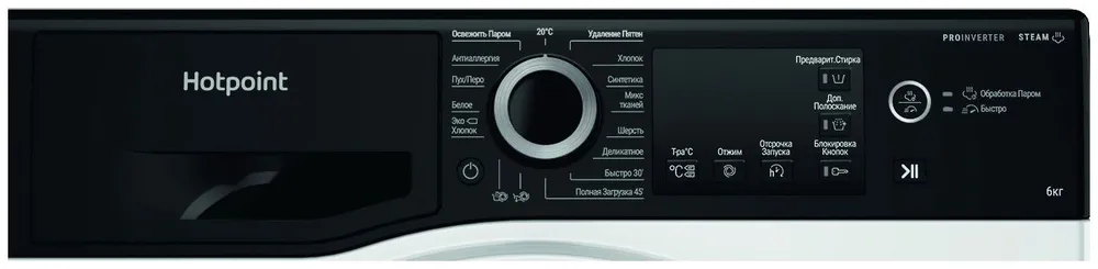 Количество программ: 16, в том числе Освежить паром, 20°C, Удаление пятен, Хлопок, Синтетика, Микс тканей, Шерсть, Деликатное, Быстро 30’, Полная загрузка 45’, Антиаллергия, Пух/Перо, Белое, Эко Хлопок