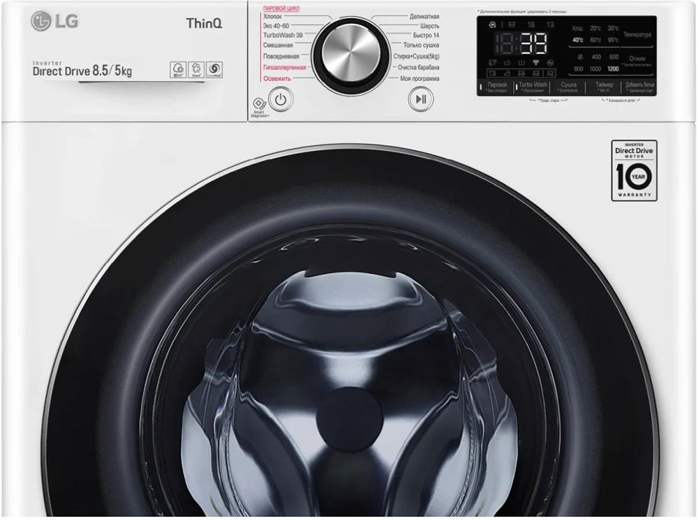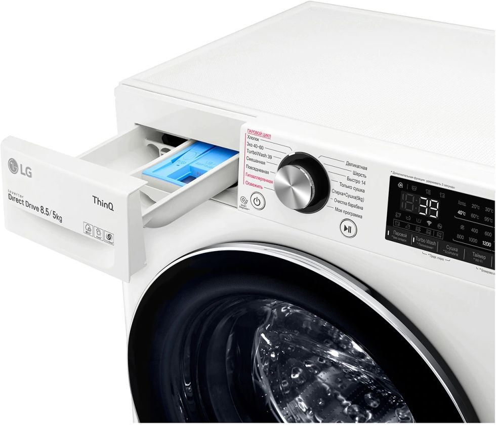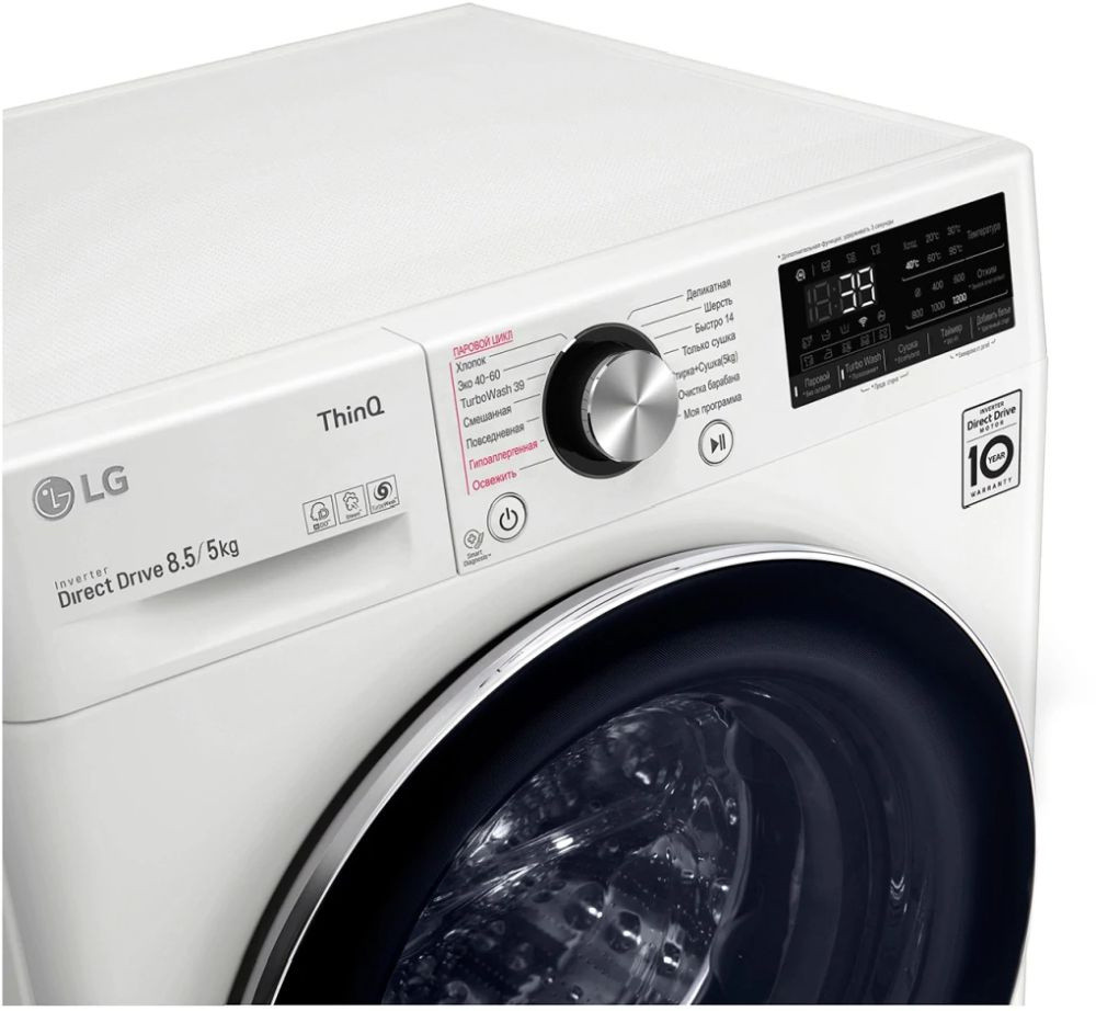 Особенности: Технология AI DD. 6 движений заботы. Функция быстрой стирки TurboWash. Функция пара Steam. Wi-Fi. Возможность управления через приложение LG ThinQ. Smart Diagnosis. Инверторный мотор с прямым приводом. Автобалансировка. Детектор загрузки. Интеллектуальная система стирки. Автоперезапуск.