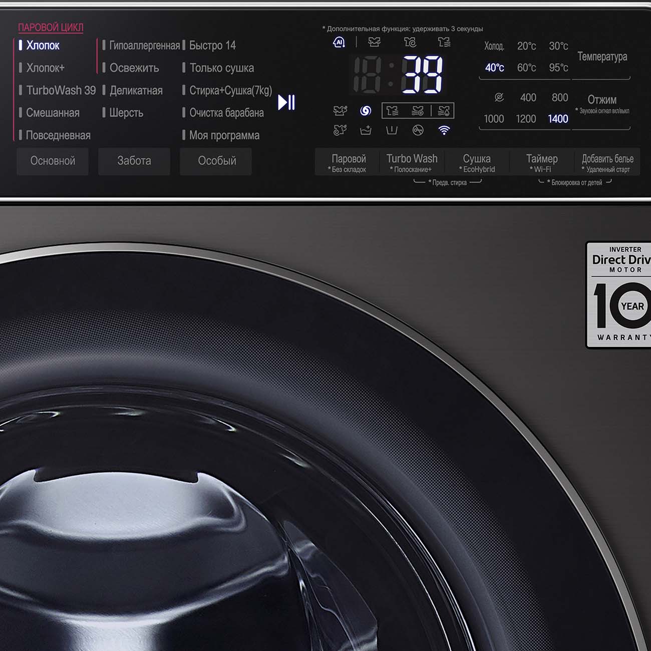 Прочие режимы и функции быстрая 14 мин , хлопок+ , стандартная (сушка) , TurboWash 39 , полоскание+ , добавить белье , интенсивная стирка , предварительная стирка , легкое глажение , эко сушка , турбо стирка , контроль пенообразования , паровая стирка