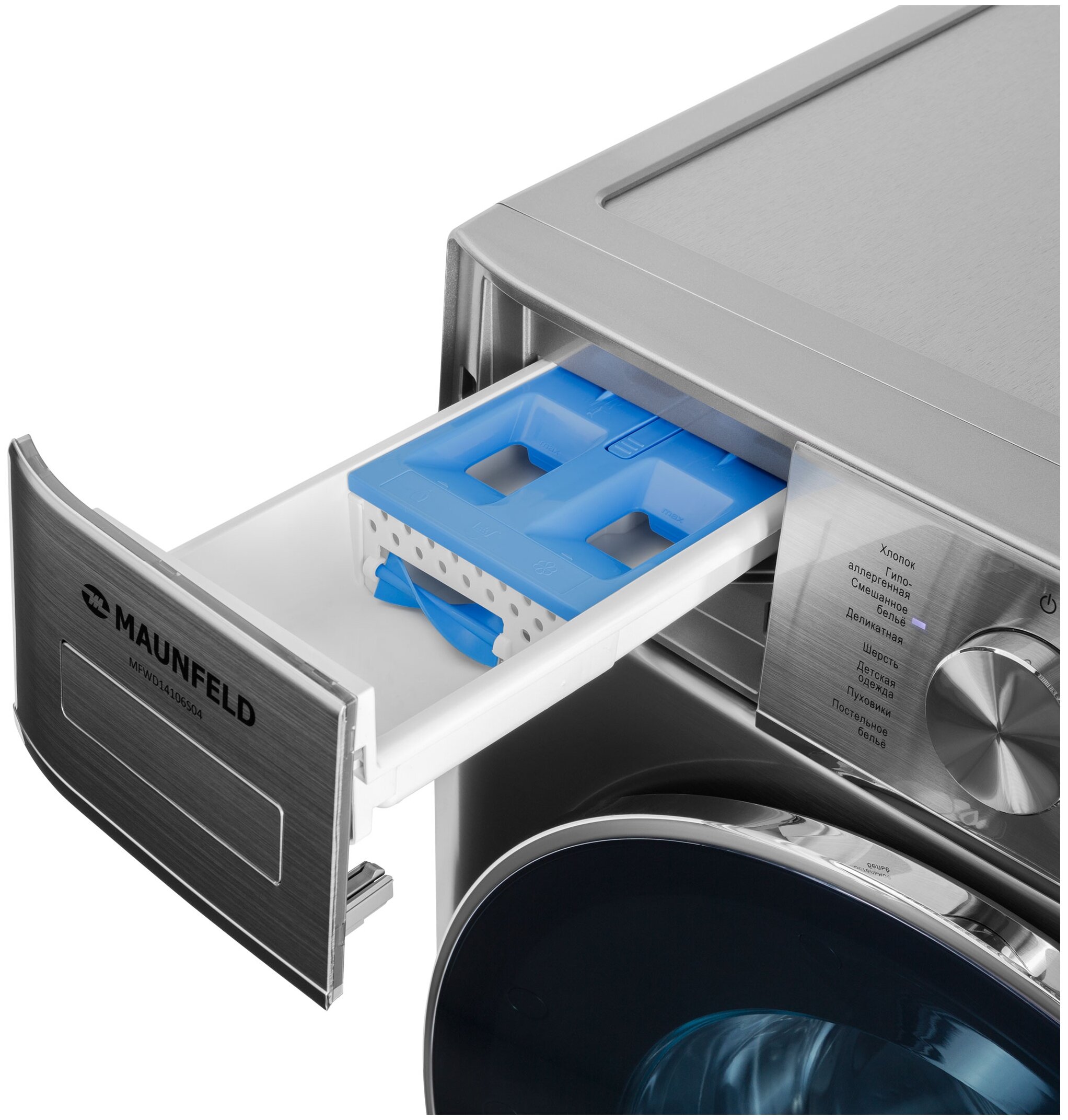 двухслойная дверца люка с антимикробным уплотнителем, внутренняя подсветка; режимы гипоаллергенной, гигиенической, воздушной и холодной стирки, программа очистки барабана