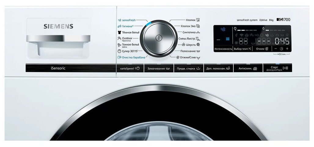 Программы SensoFresh, гигиена+, тёмное бельё, Outdoor, тонкое бельё, супер 30/15, очистка барабана, хлопок, хлопок Эко, синтетика, смешанное/быстро, шерсть, полоскание, отжим/слив