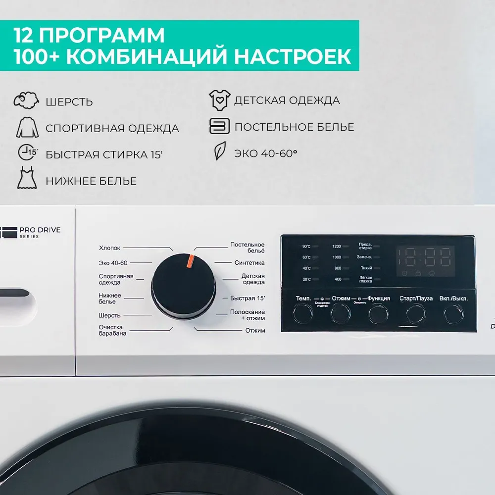 Программы стирки: Стирка изделий из хлопка, Стирка спортивной одежды, Стирка нижнего белья, Стирка изделий из шерсти, Стирка изделий из синтетики, Стирка детской одежды, Быстрая стирка, Полоскание + отжим, Отжим, Замачивание, Предварительная стирка