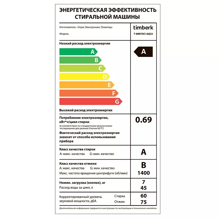 Уровень шума цикла стирки, дБА