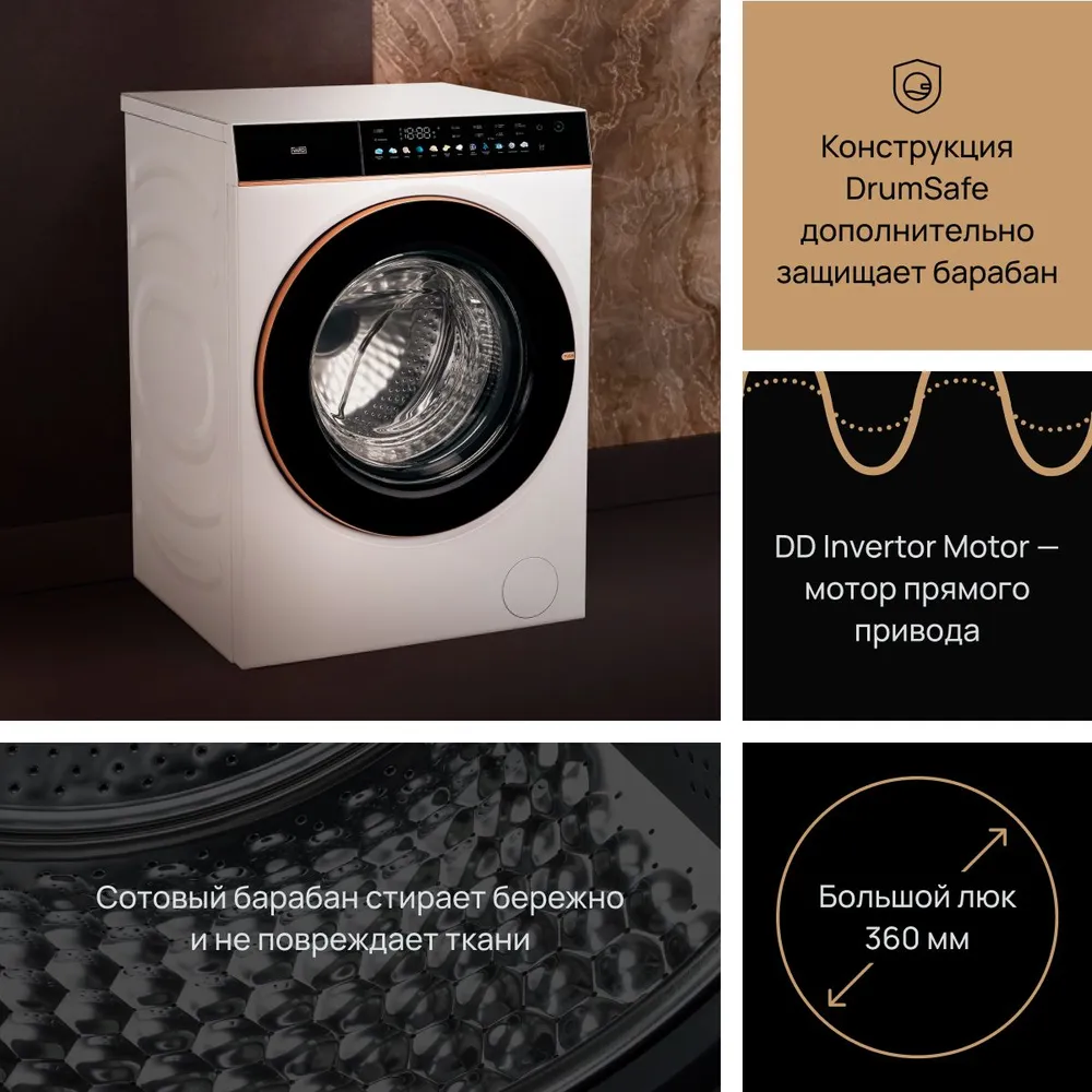 Программы стирки: Стирка смешанных тканей, Быстрая стирка, Стирка детской одежды, Полоскание + отжим, Стирка верхней одежды, Стирка изделий из хлопка, Стирка изделий из шелка, Стирка изделий из шерсти