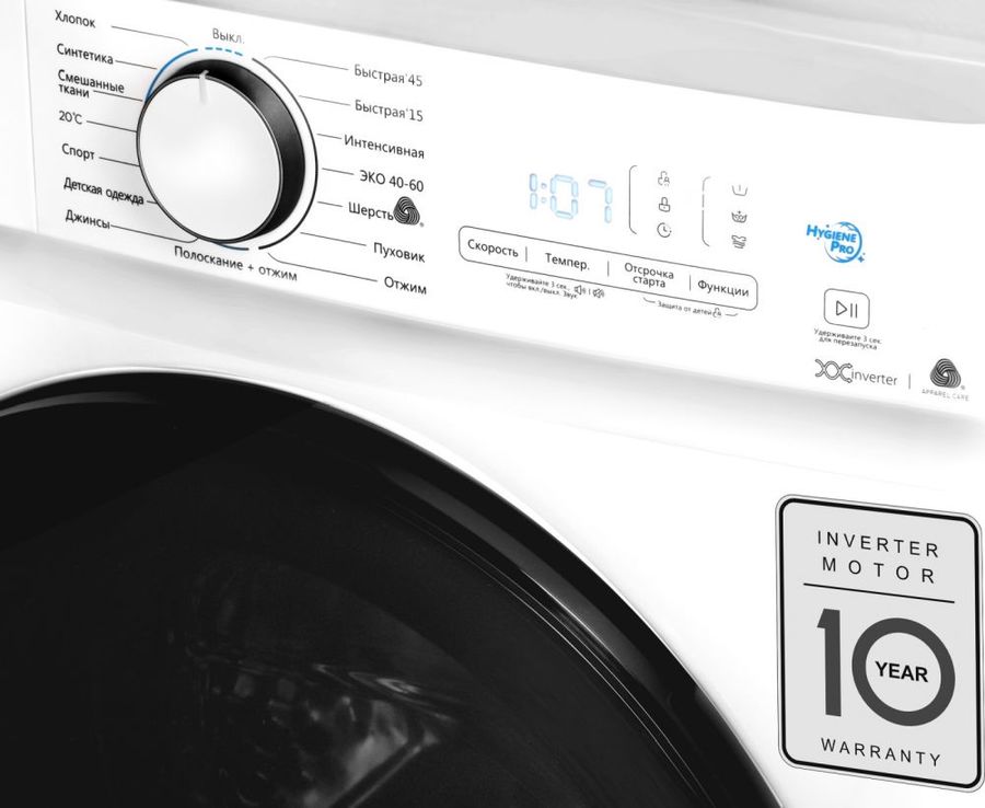 Программы: Интенсивная, Быстрая 15’, Быстрая 45’, ЭКО 40-60, Шерсть, Пуховик, Джинсы, Отжим, Хлопок, Синтетика, Смешанные ткани, 20С, Спорт, Детская одежда, Полоскание и отжим