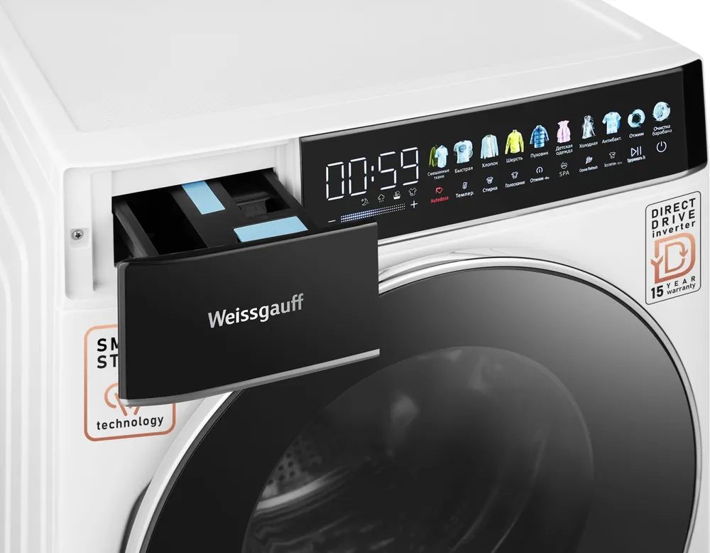 Программы стирки: Стирка смешанных тканей, Быстрая стирка, Стирка изделий из хлопка, Стирка изделий из шерсти, Стирка пуховых вещей, Стирка детской одежды, Отжим