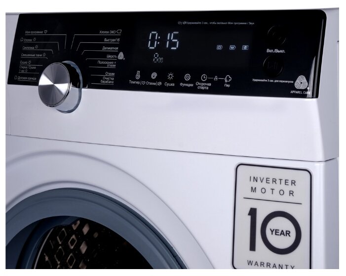 дополнительное полоскание, выбор скорости отжима, без складок, замачивание, предварительная стирка, быстрая стирка, выбор температуры стирки, сушка, отсрочка старта, старт/пауза, блокировка управления