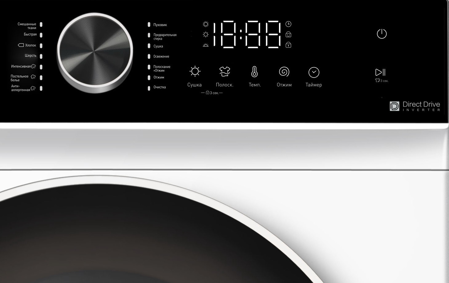 Антибактериальная защита, Автоматическая блокировка двери, защита от перелива, защита от перегрева, Автобалансировка барабана, Черная матовая панель управления, Большой премиальный люк с хромированным ободом