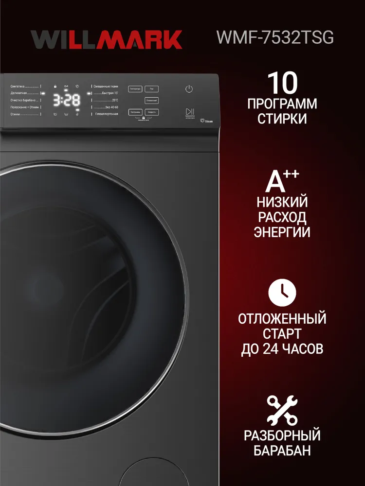 Функциональные особенности Отложенный старт, Выбор температуры, Выбор скорости отжима, Блокировка панели, Пар.