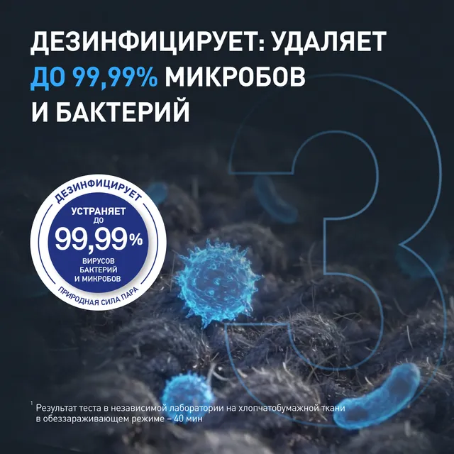 Дезинфицирующая сила пара эффективно устраняет до 99,99% бактерий и вирусов³, оседающих на вашей одежде, обеспечивая профессиональный и бережный уход за текстилем.