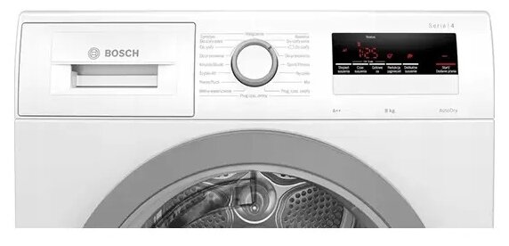 Сушильная машина оснащена люком диаметром 34 см, расположенном на фронтальной части корпуса. Максимально допустимая загрузка не должна превышать 8 кг. Возможна отсрочка времени запуска устройства на срок до 24 ч. Доступно 15 рабочих программ для деликатной сушки разных типов тканей.