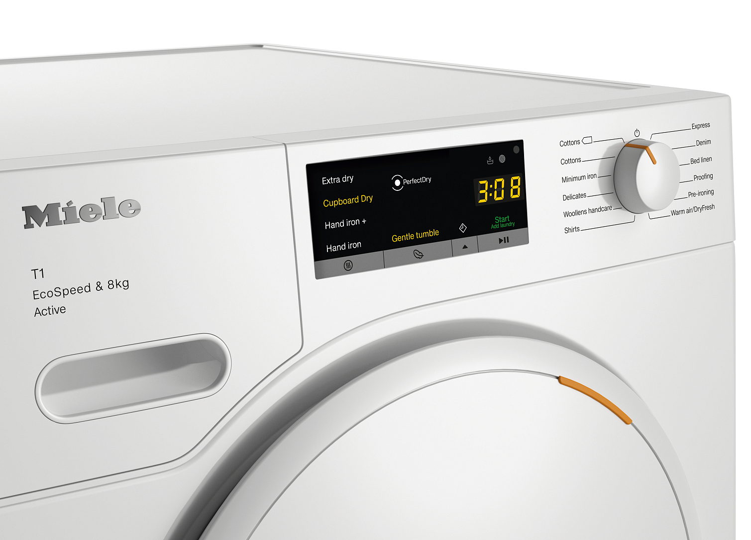 Технология конденсационной сушки с тепловой помпой обеспечивает эффективное и бережное обращение с вещами, а система PerfectDry автоматически регулирует процесс в зависимости от типа ткани. EcoDry и EcoSpeed гарантируют экономию энергии, поддерживая класс энергопотребления A+++. Система FragranceDos с одной капсулой добавляет приятный аромат. Подсветка из светодиодов и реверс барабана из нержавеющей стали способствуют равномерной сушке и защите от сминания. Функция AddLoad позволяет добавлять вещи в процессе, а отложенный старт до 24 часов и индикация остаточного времени делают использование максимально комфортным.
