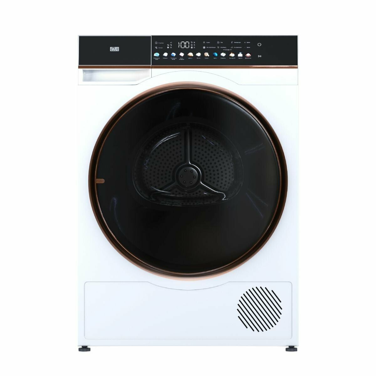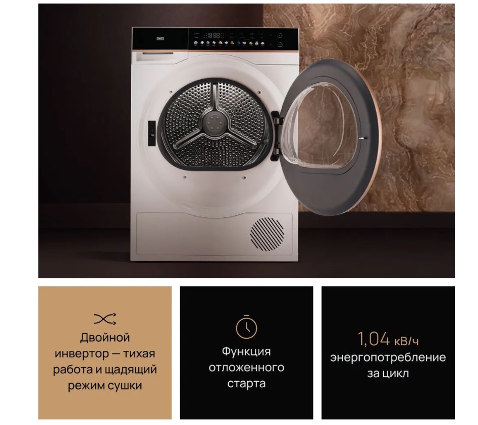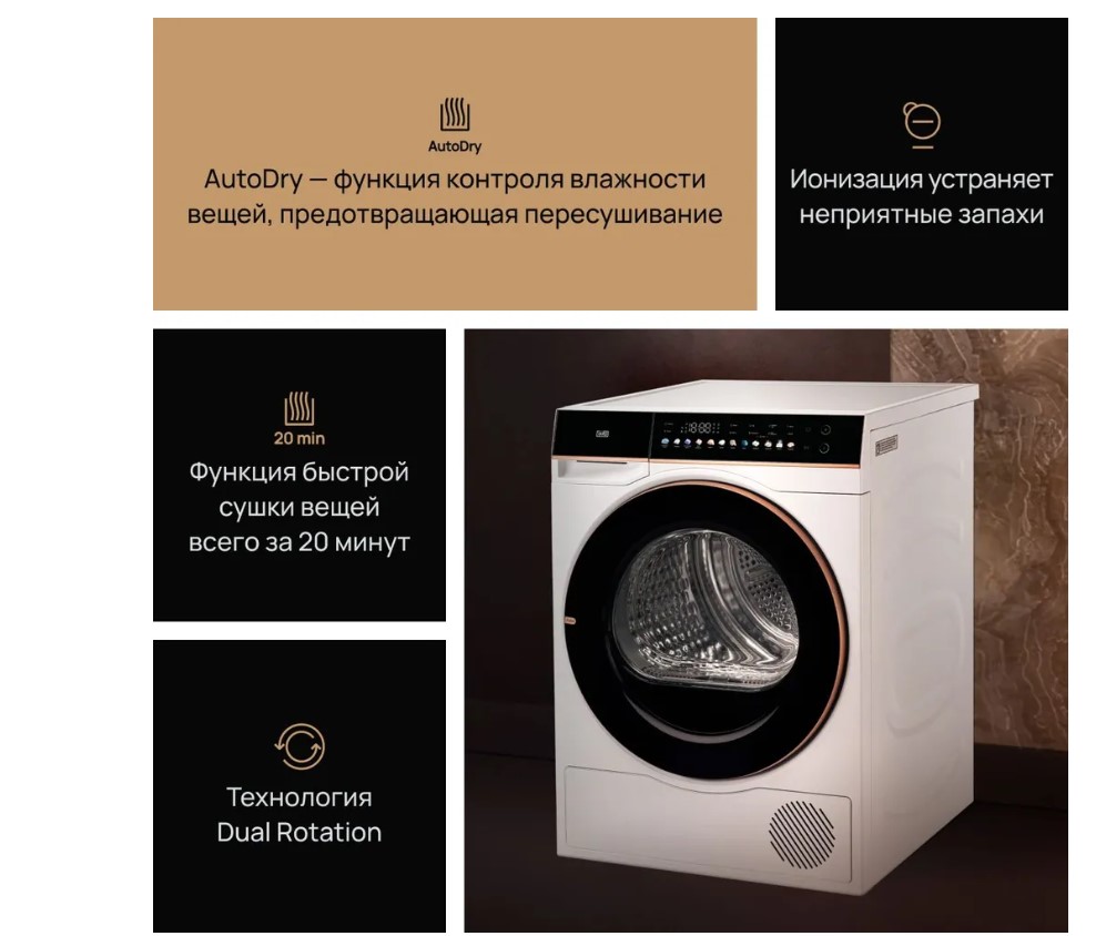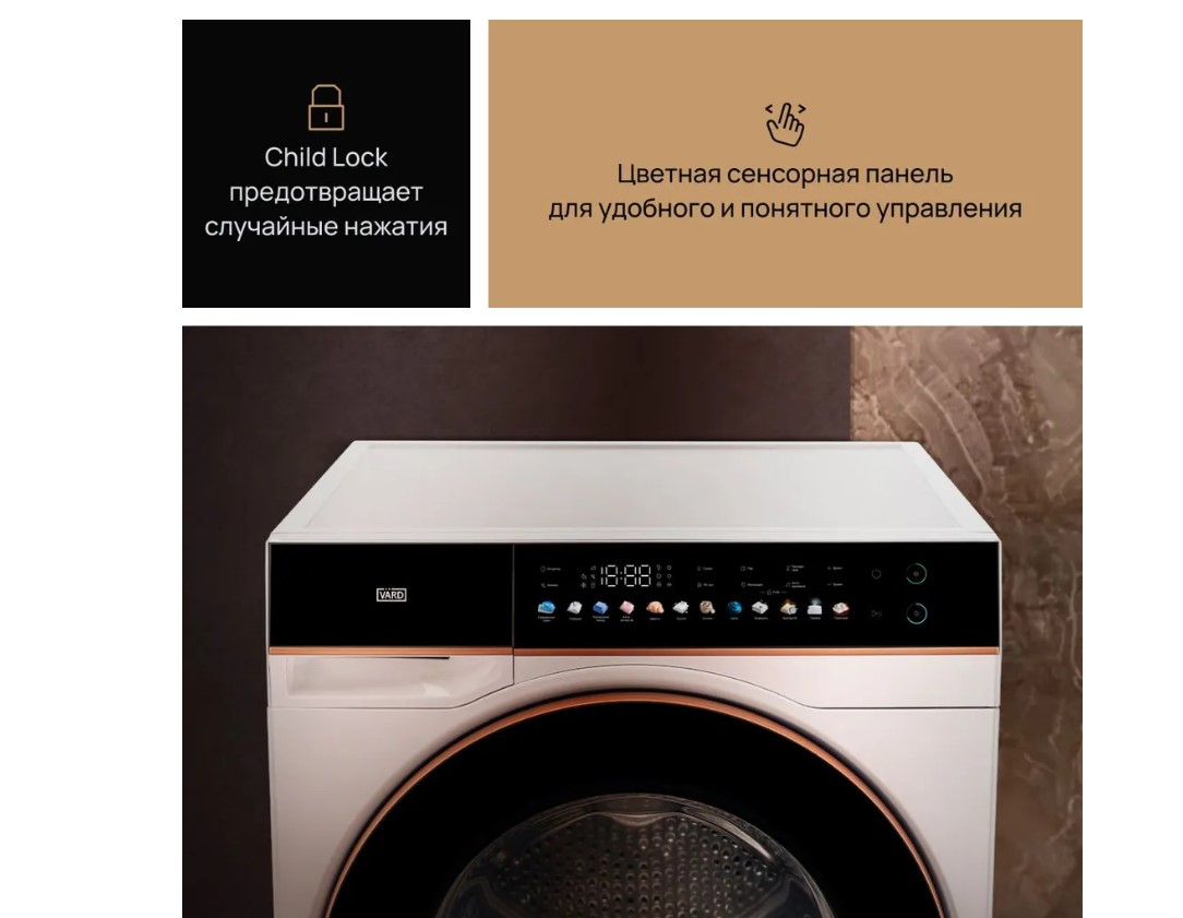 Сушильная машина VARD VTH61 с максимальной загрузкой 10 кг и технологией сушки Heat pump сочетает в себе лаконичный дизайн и передовые технологии. Heat Pump - энергоэффективная технология сушки с использованием теплового насоса. В ходе цикла нагретый воздух при помощи вентилятора попадает в барабан и деликатно сушит вещи. Генератор ионов создает заряженные частицы, которые освобождают белье и одежду от неприятных запахов и пыли, а также обеспечивают бережную заботу о вещах. Сушильный барабан с функцией автоматической остановки замеряет влажность загруженных для сушки вещей. Если барабан определит, что белье или одежда сухие, до завершения программы, то остановится сам, предотвращая пересушивание. UV-луч - функция сушильной машины, которая активируется в конце цикла сушки. Проходя через структуру ткани, ультрафиолет меняет структуру потенциально опасных микроорганизмов и предотвращает их дальнейшее размножение. В отличие от стандартных моделей, сушильный барабан с технологией Dual Rotation вращается в двух направлениях, что создаёт эффект встряски вещей, обеспечивая более эффективную сушку и гладкость ткани белья и одежды. Четырехступенчатый фильтр собирает пыль, ворсинки и остатки ниток из белья и одежды. Первый этап - фильтр высокой плотности для сбора волос и ниток, второй этап - внешний фильтр, третий этап - внутренний фильтр, четвертый этап - поглотитель пыли до 0,5 микрона. Таким образом, он очищает одежду от пыли и ворса, предотвращая их распространение по дому.