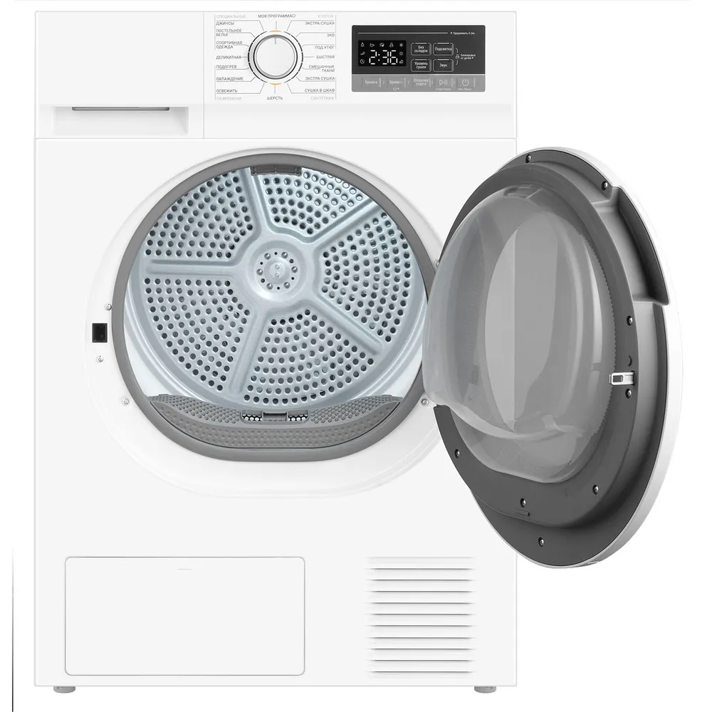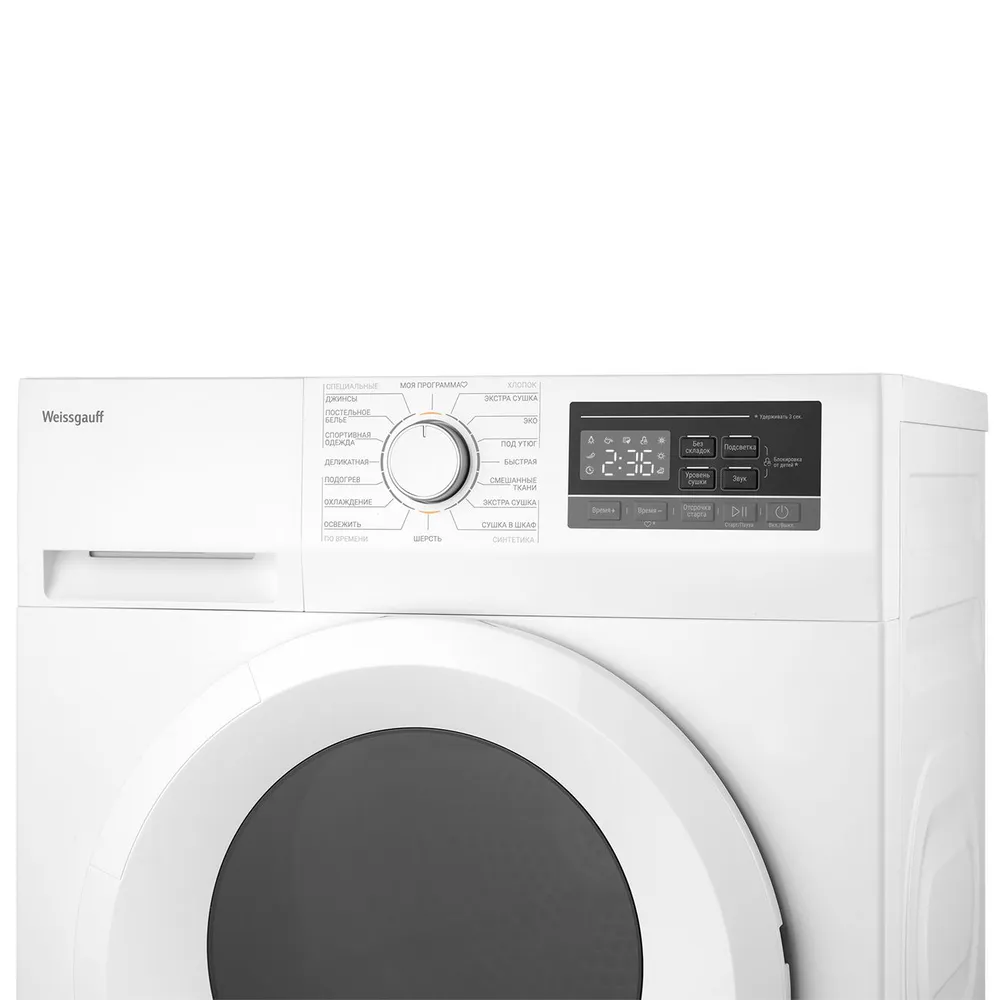 Функциональные особенности: Контроль остаточной влажности, Отсрочка запуска, Звуковой сигнал, Отключение звукового сигнала