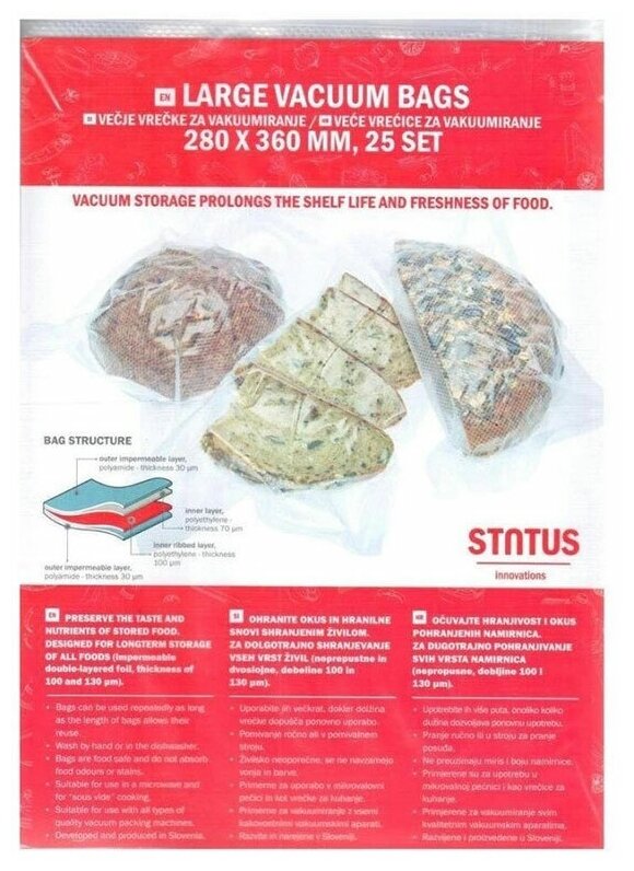 Вакуумные пакеты и рулоны STATUS производятся в Словении. Все используемые материалы европейского производства со всеми необходимыми сертификатами. Наши пакеты и рулоны для вакууматоров безопасны для продуктов питания и не передают продуктам посторонний вкус и запах. Для вас это означает, что вы можете использовать их для хранения всех видов продуктов, не задумываясь, и ваша еда сохранит свой естественный вкус и аромат. Наши вакуумные пакеты также подходят для заморозки и приготовления пищи.