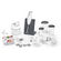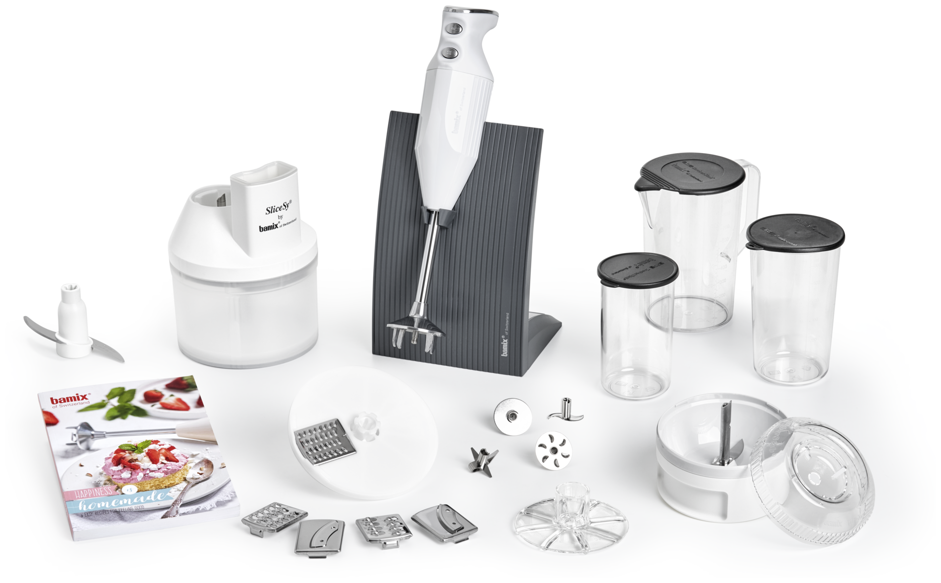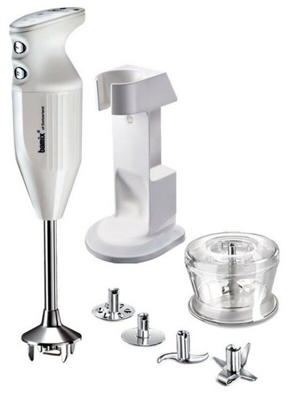 стакан с крышкой 400 мл и 600 мл; кувшин 1000 мл; материал погружной части: оцинкованная латунь; материал лезвия: нержавеющая сталь; насадки: насадка для взбивания, насадка для измельчения/смешивания, насадка для смешивания, терка/шинковка (вставка в диск), терка (вставка в диск), шинковка (вставка в диск), шинковка (односторонний диск)