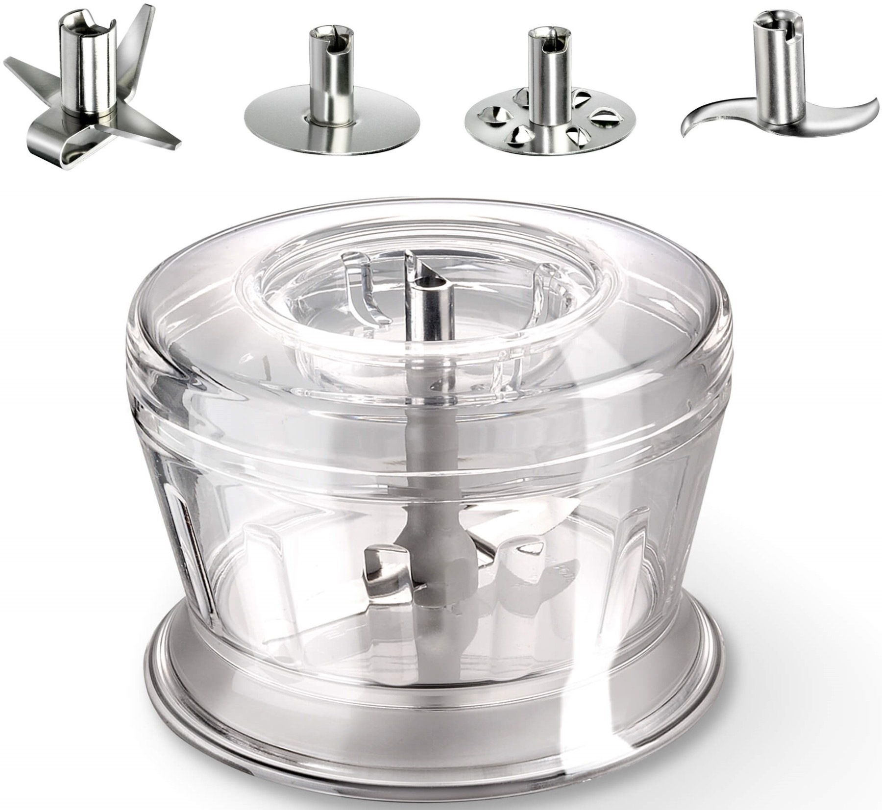 - насадка для взбивания; насадка для; перемешивания; нож для рубки мяса и овощей; подставка для хранения