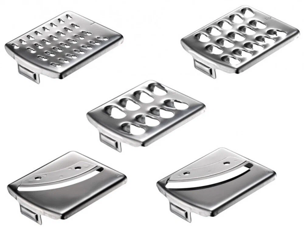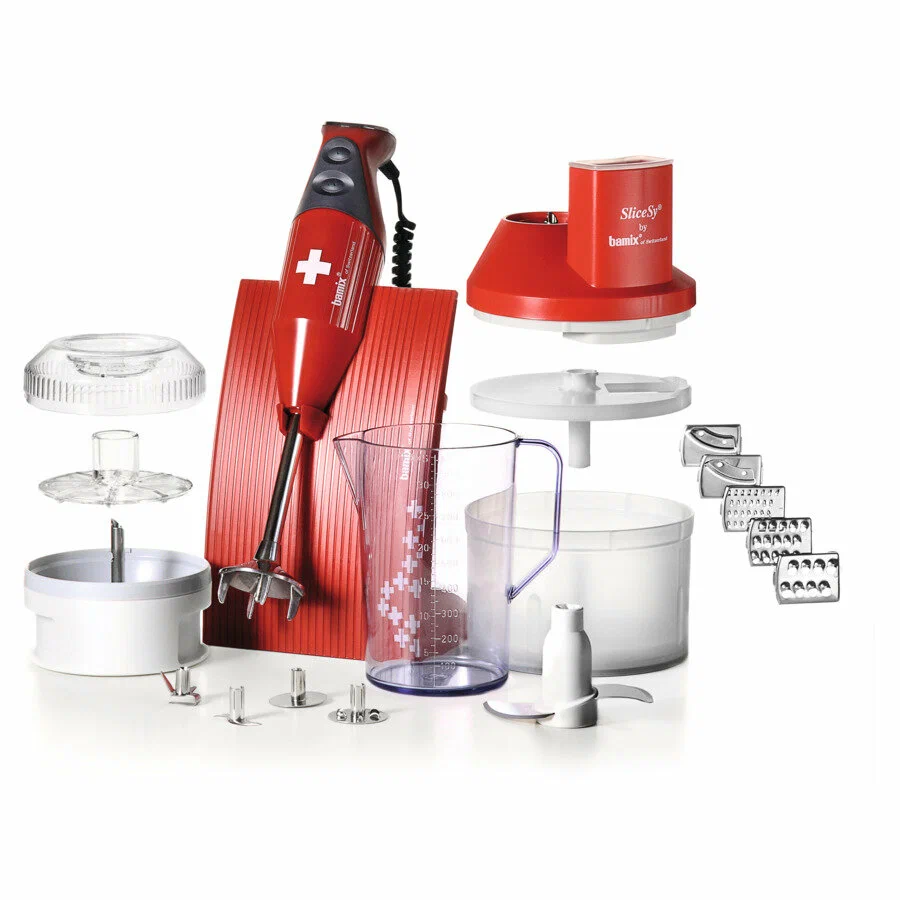 многофункциональная насадка; насадка для взбивания: для соусов и шейков; насадка для перемешивания: для майонеза, пудингов и кондитерских изделий; насадка диск; измельчитель: для свежей зелени, орехов, шоколада и твердых сортов сыра; нож для рубки мяса и овощей: идеально подходит для резки мяса, рыбы и длинноволокнистых овощей, например сельдерея, спаржи и фенхеля; процессор; прибор SliceSy с 6 ножами; подставка настольная