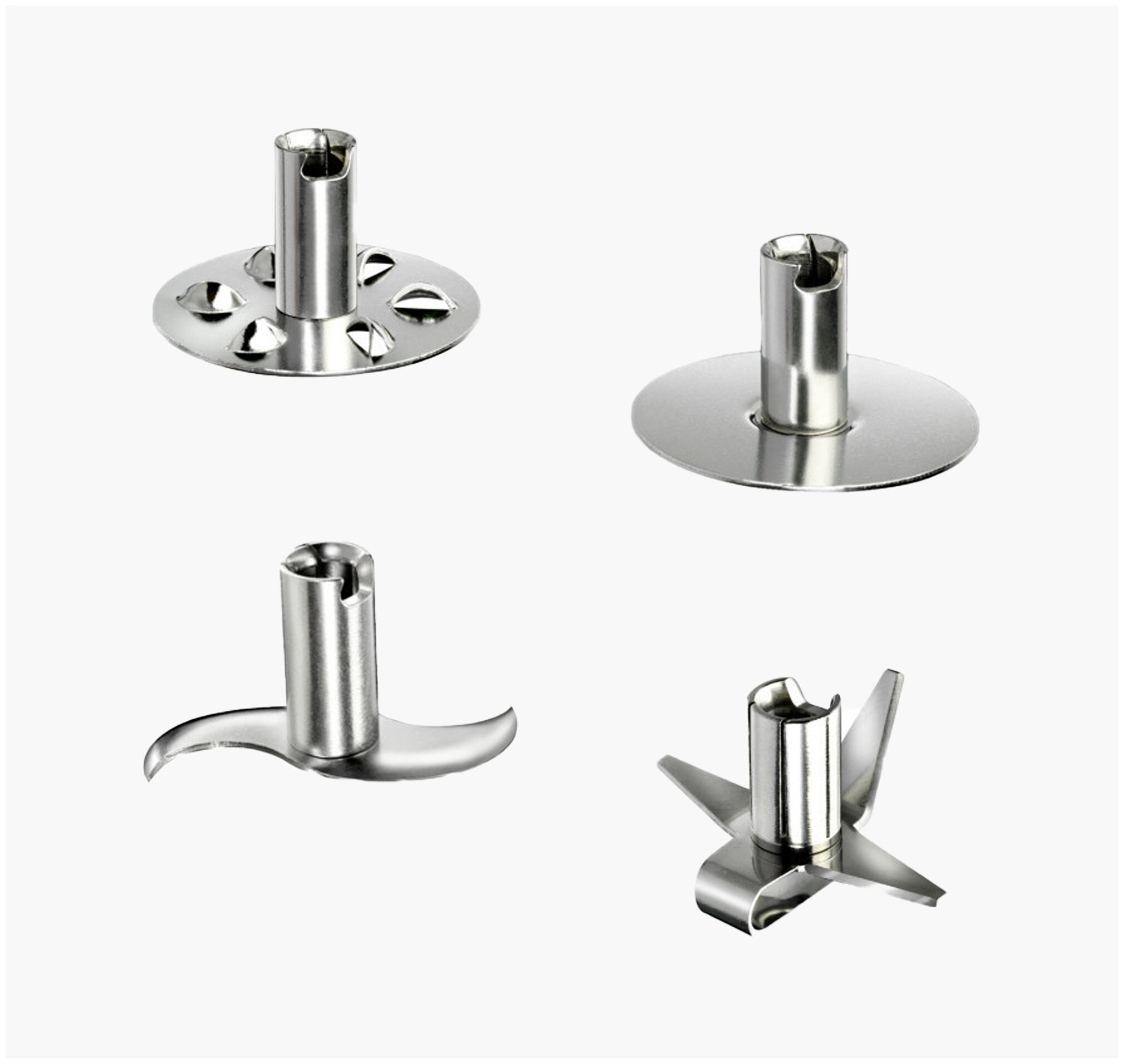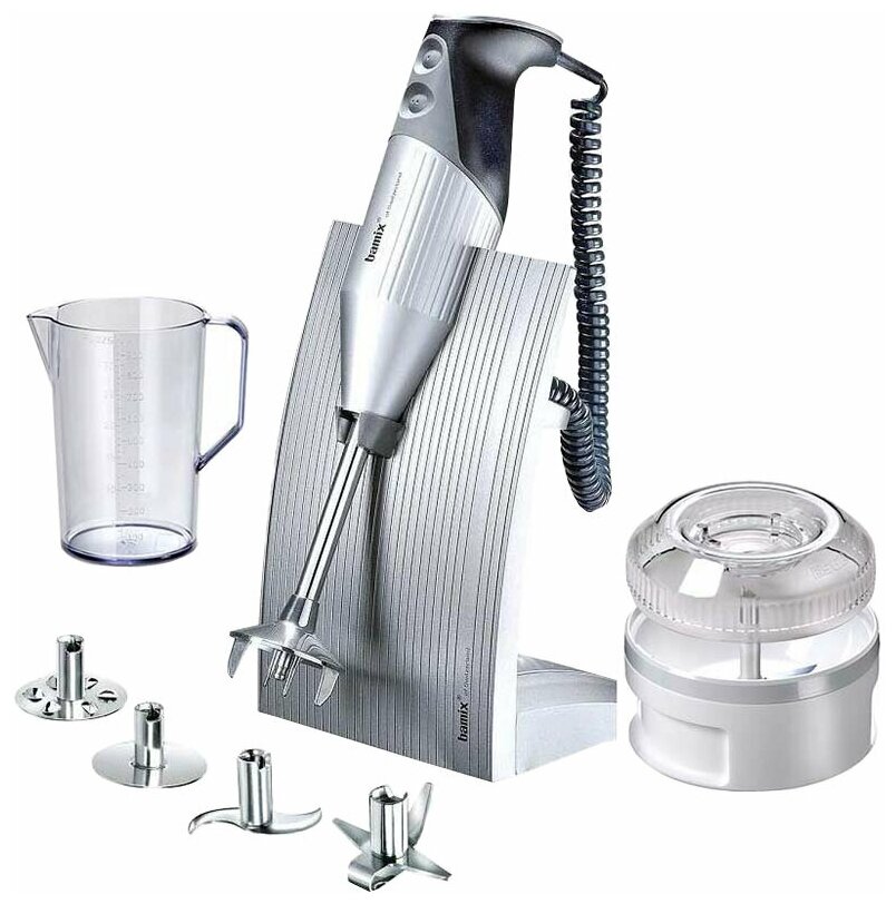- многофункциональная насадка; насадка для взбивания; насадка для перемешивания; процессор с растирочным диском; подставка для хранения; двойная изоляция; 2 безопасных выключателя с мягкой окантовкой