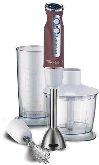 Особенности 2 режима мощности. 8 скоростных режимов. В комплекте насадка для соусов, венчик, чаша-измельчитель 0,5 л, мерный стакан 0,5 л.