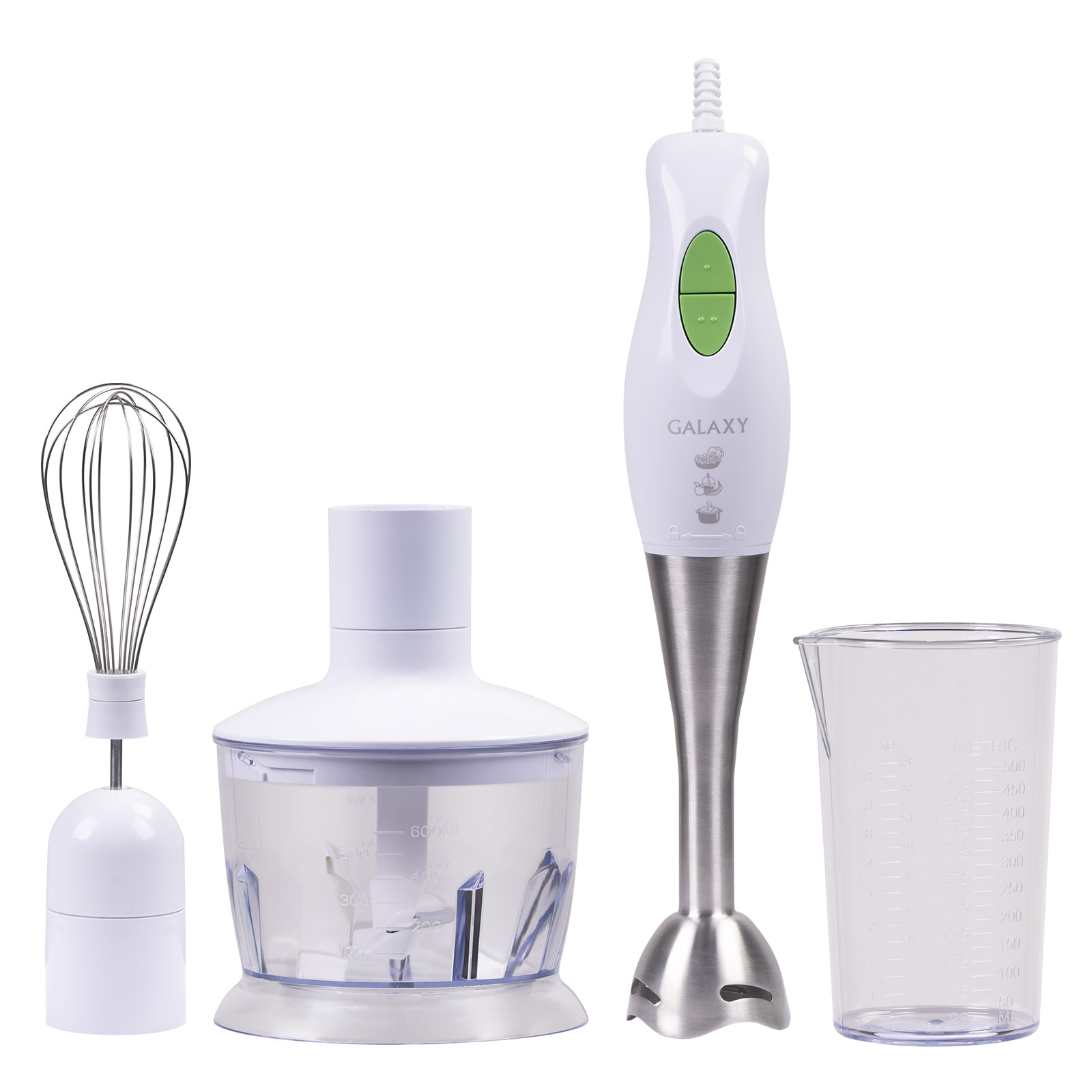 Погружной блендер GALAXY с набором принадлежностей удобно мыть и хранить.Модель имеет 2 скоростных режима, которые удобно переключать, поскольку все кнопки находятся на ручке.