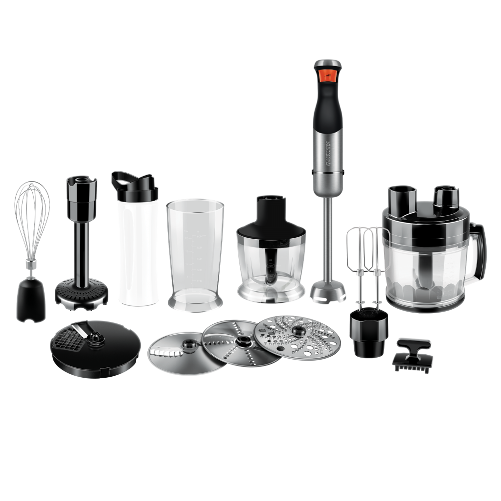 Моторный блок - 1 шт. Большая чаша для измельчения с крышкой - 1 шт. Малая чаша для измельчения с крышкой - 1 шт. Стакан для смешивания - 1 шт. Дорожная бутылка - 1 шт. Насадка-блендер - 1 шт. Насадка-венчик - 1 шт. Насадки для миксера - 2 шт. Переходник для насадок миксера - 1 шт. Переходник для насадки-венчика - 1 шт. Насадка-диск для нарезки кубиками - 1 шт. Насадка-диск для шинковки/терки - 1 шт. Насадка-диск для картофеля фри - 1 шт. Насадка-диск для драников - 1 шт. Насадка для приготовления пюре - 1 шт. S-образные ножи (для большой и малой чаш) - 2 шт. Горизонтальный нож - 1 шт. Съемная втулка - 1 шт. Толкатель - 1 шт. Толкатель для очистки решетки - 1 шт.
