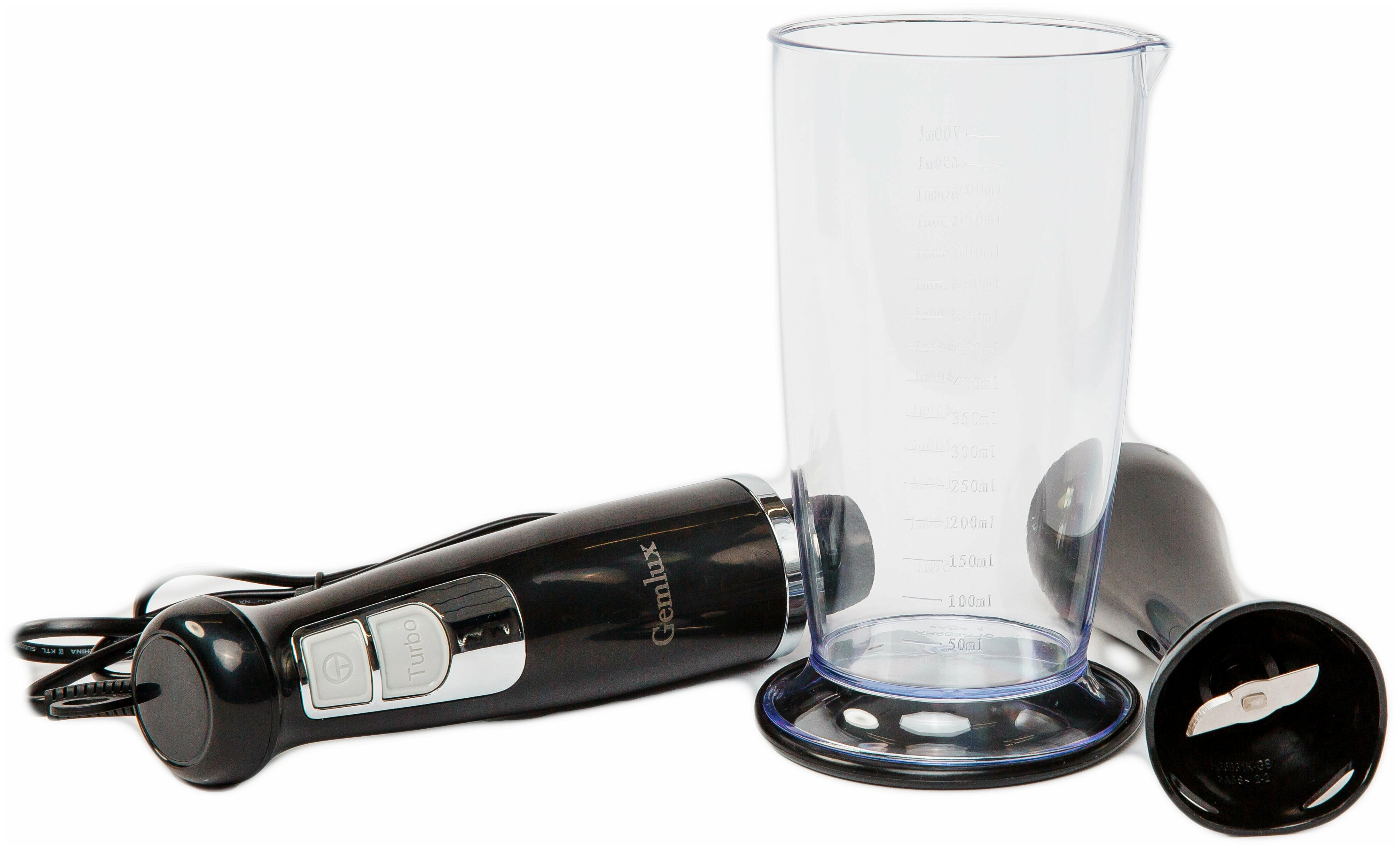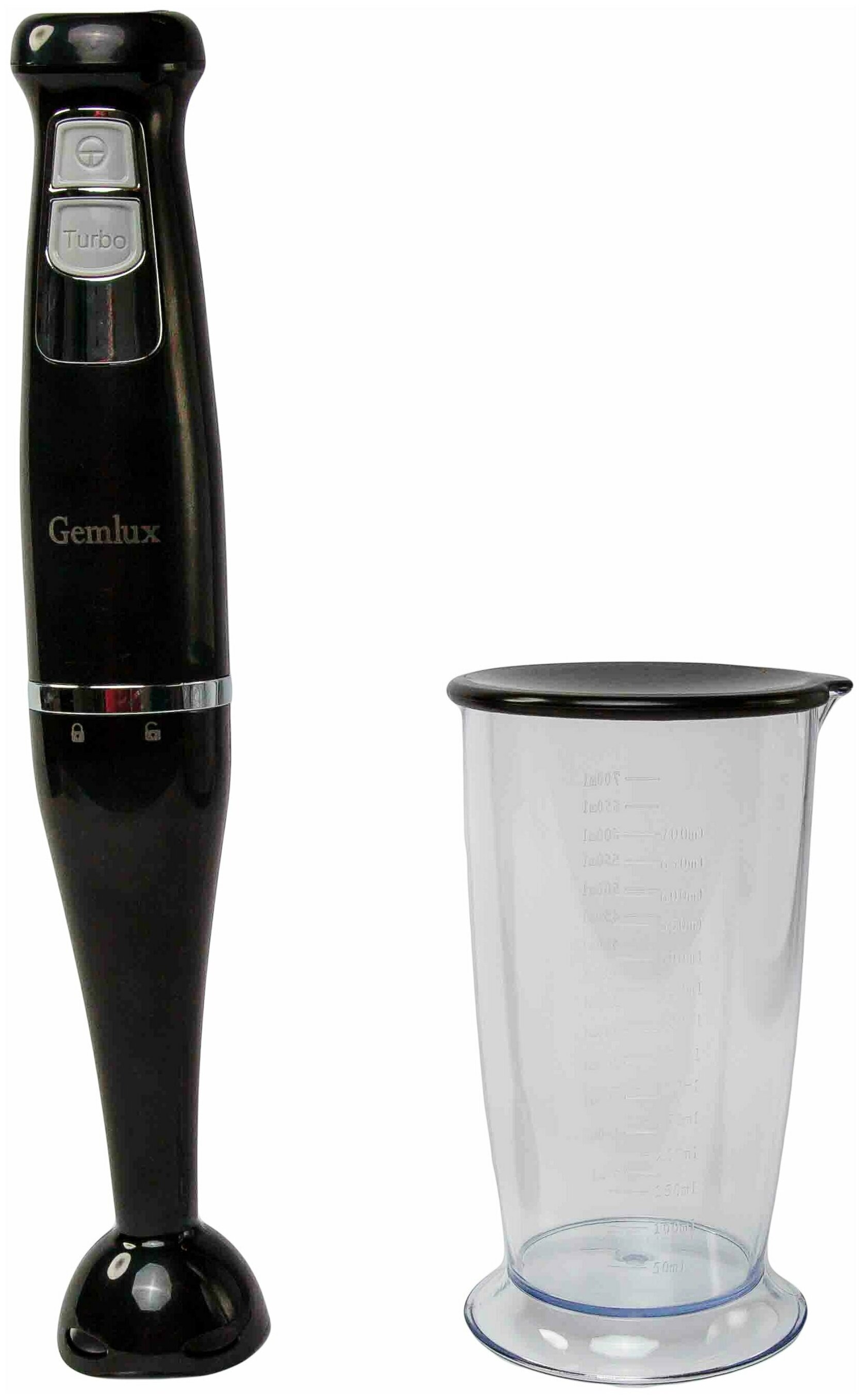 Габаритные размеры - 49х49х375 мм. Мощность - 0,60 кВт. Параметры сети - 220/50/1. Количество скоростей двигателя - 1 скорость + турбо-режим. Материал корпуса – пластмасса. Серия Gemlux – Basic. 1 скорость (13500 об/мин) + турбо-режим (14500 об/мин). Материал корпуса – пластмасса. Хромированные кнопки переключения скоростей. В комплекте: съемная насадка с 2-лопастным ножом из нерж.стали, мерный стакан объемом 700 мл с крышкой.