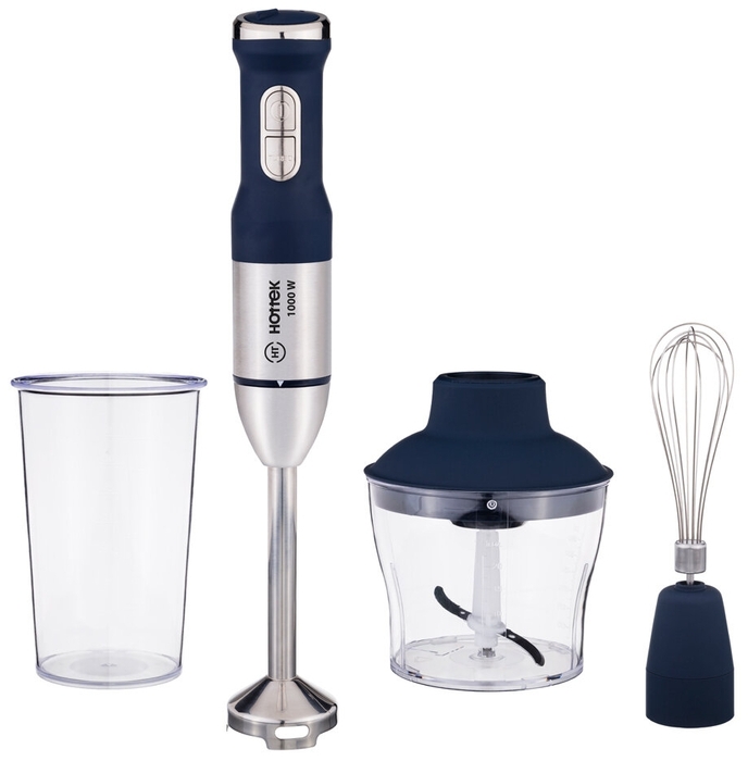 Блендерный набор HT-975-100 совмещает в себе функции блендера, чоппера и миксера для идеальной обработки продуктов. Благодаря мощному мотору (1000 Вт) прибор быстро и эффективно измельчит продукты любой твердости. В чаше измельчителя (чоппера) объёмом 600 мл Вы сможете измельчать продукты, например готовить фарш. В мерном стакане объёмом 800 мл возможно измельчение и перемешивание продуктов. А с помощью насадки-венчика Вы сможете взбивать крем для приготовления десертов. Имеется плавная регулировка, что позволит наиболее точно установить оптимальный режим для обработки различных видов продуктов. Готовьте супы-пюре, фарш, соусы, детское питание, коктейли, кремы, десерты при помощи стильного, элегантного блендерного набора Hottek, который станет незаменимым на Вашей кухне! Технические характеристики: Максимальная мощность 1000 Вт/ Прорезиненное покрытие Soft touch, Плавная регулировка скорости, Турбо режим, Насадка – блендер из нержавеющей стали,Насадка-венчик, Чаша измельчителя 600 мл, Мерный стакан 800 мл
