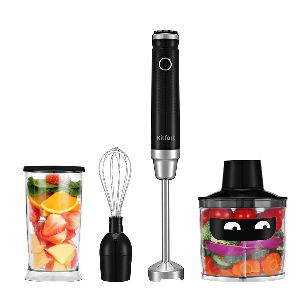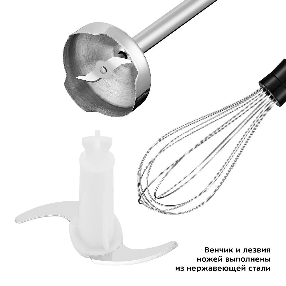 Погружной блендер — универсальное кухонное устройство с которым вы сможете приготовить множество блюд для себя, своих родных и друзей! Прибор имеет функции измельчителя, погружного блендера, а также в комплекте есть венчик для взбивания.