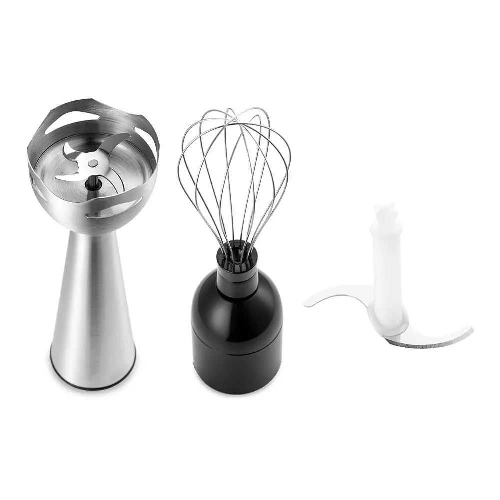 Прибор может выполнять функции измельчителя, погружного блендера, а также в комплекте есть венчик для взбивания. С помощью измельчителя можно быстро измельчить мясо, твёрдый сыр, овощи, травы, чеснок, ягоды и многое другое на ваш вкус!