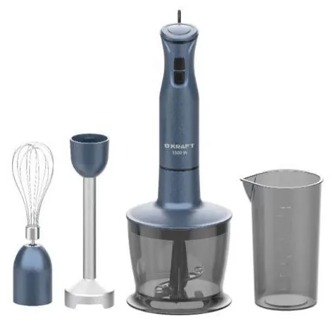 Комплектация — Мерный стакан объемом 0,8 л, венчик для взбивания, измельчитель 0,5 л