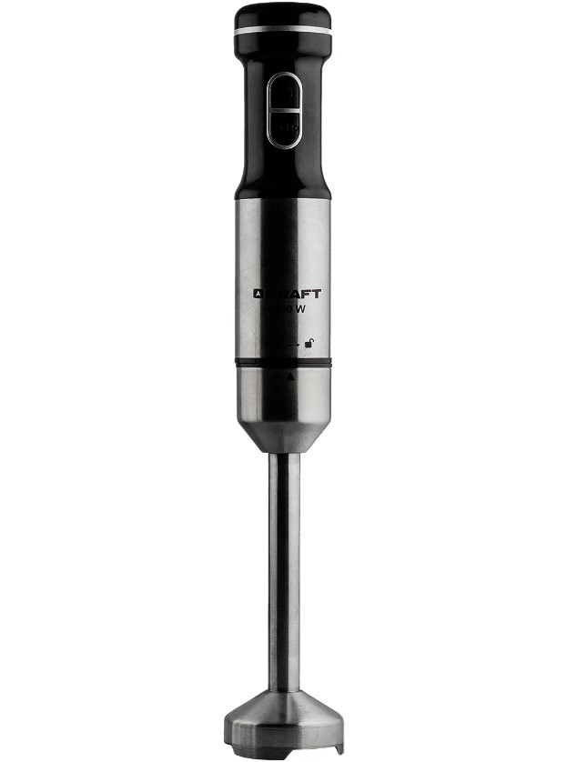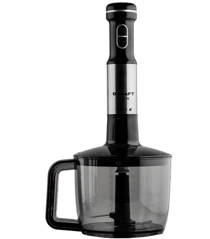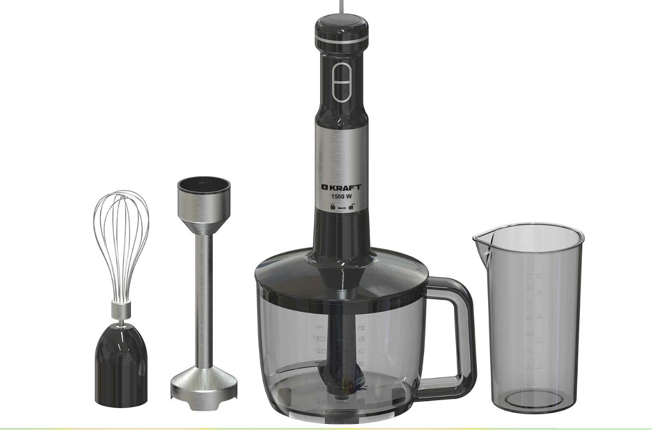 Блендер KRAFT KF-HB1555BX – погружная модель, функциональность которой расширена благодаря наличию мини-комбайна 1.5 л и насадки-венчик.