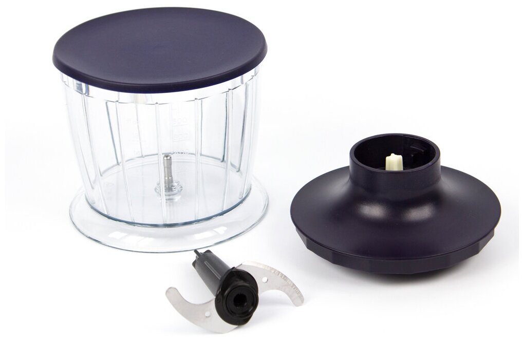 Погружная «нога» пригодится для пюре и детского питания. Острые ножи, выполненные из нержавеющей стали, обеспечат однородную текстуру без комочков. Венчик взобьёт яичные белки, кремы, муссы, соусы и молочные коктейли. А в большом измельчителе объёмом 600 мл вы сможете сделать, например, овощные заготовки для суповой заправки, фарш для тефтелей, мясо для макарон по-флотски.